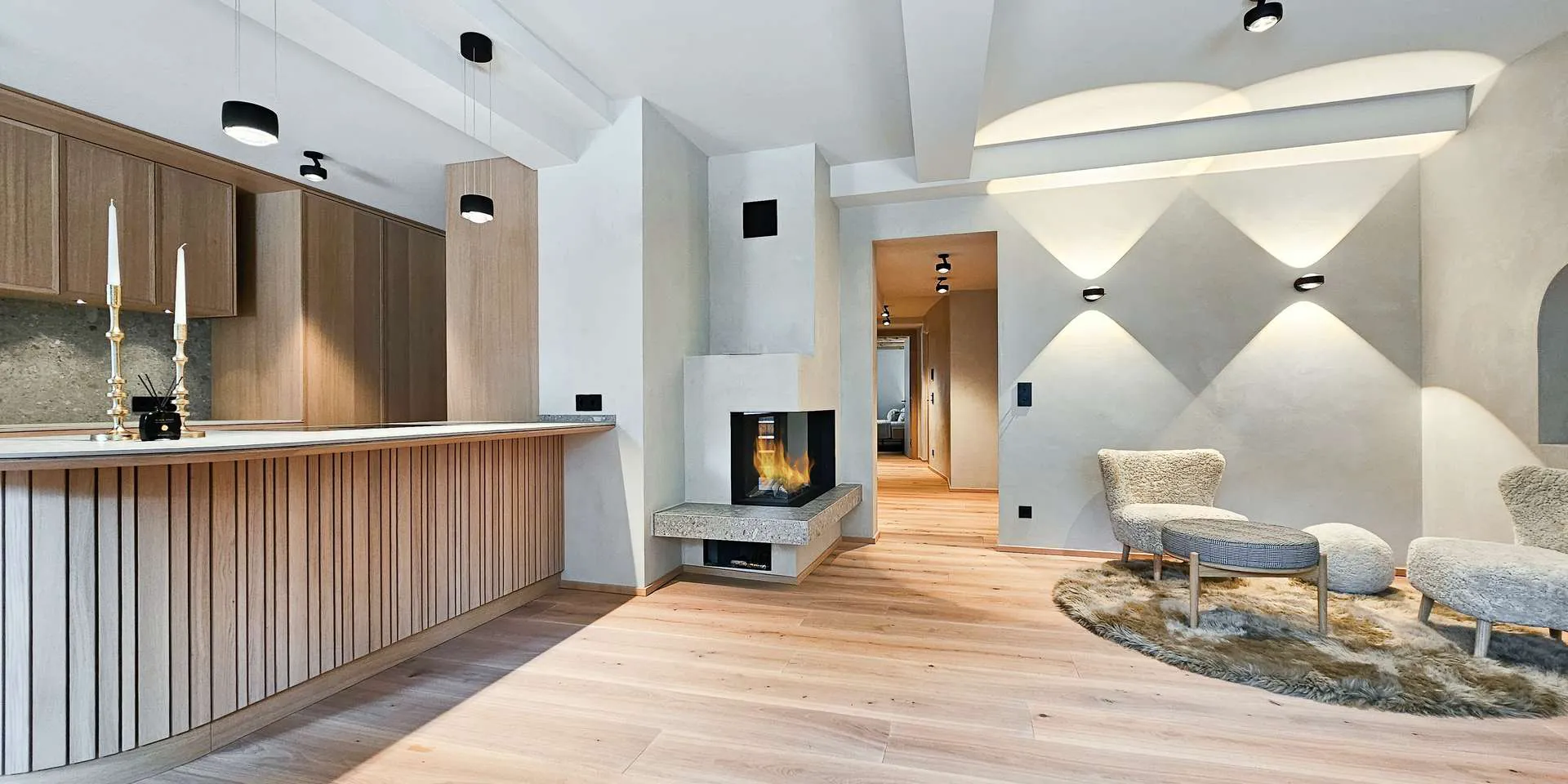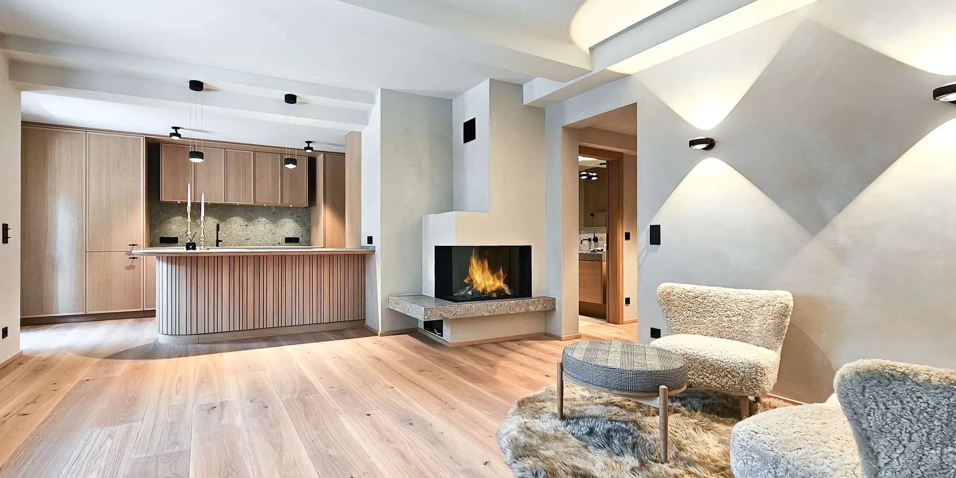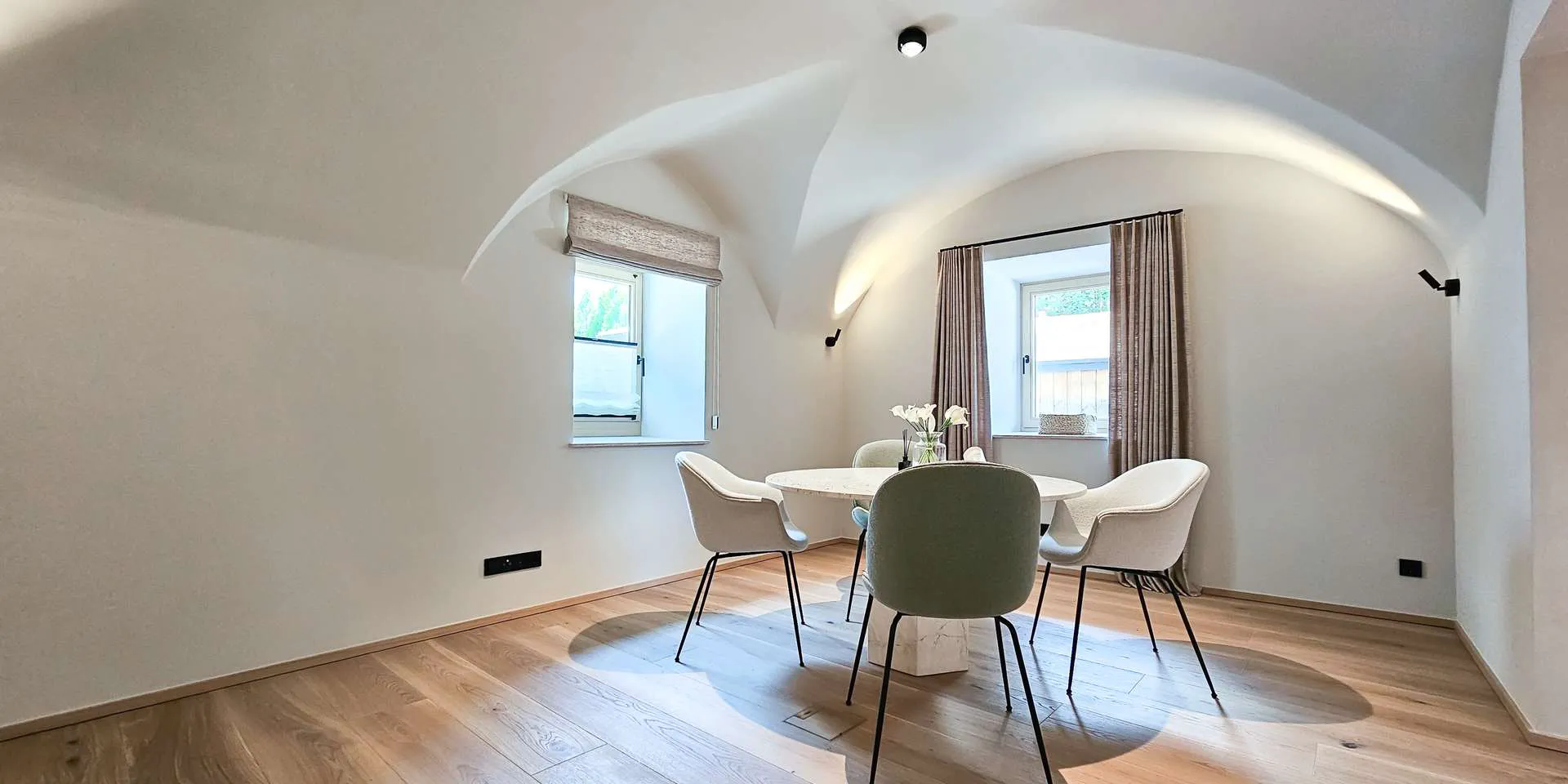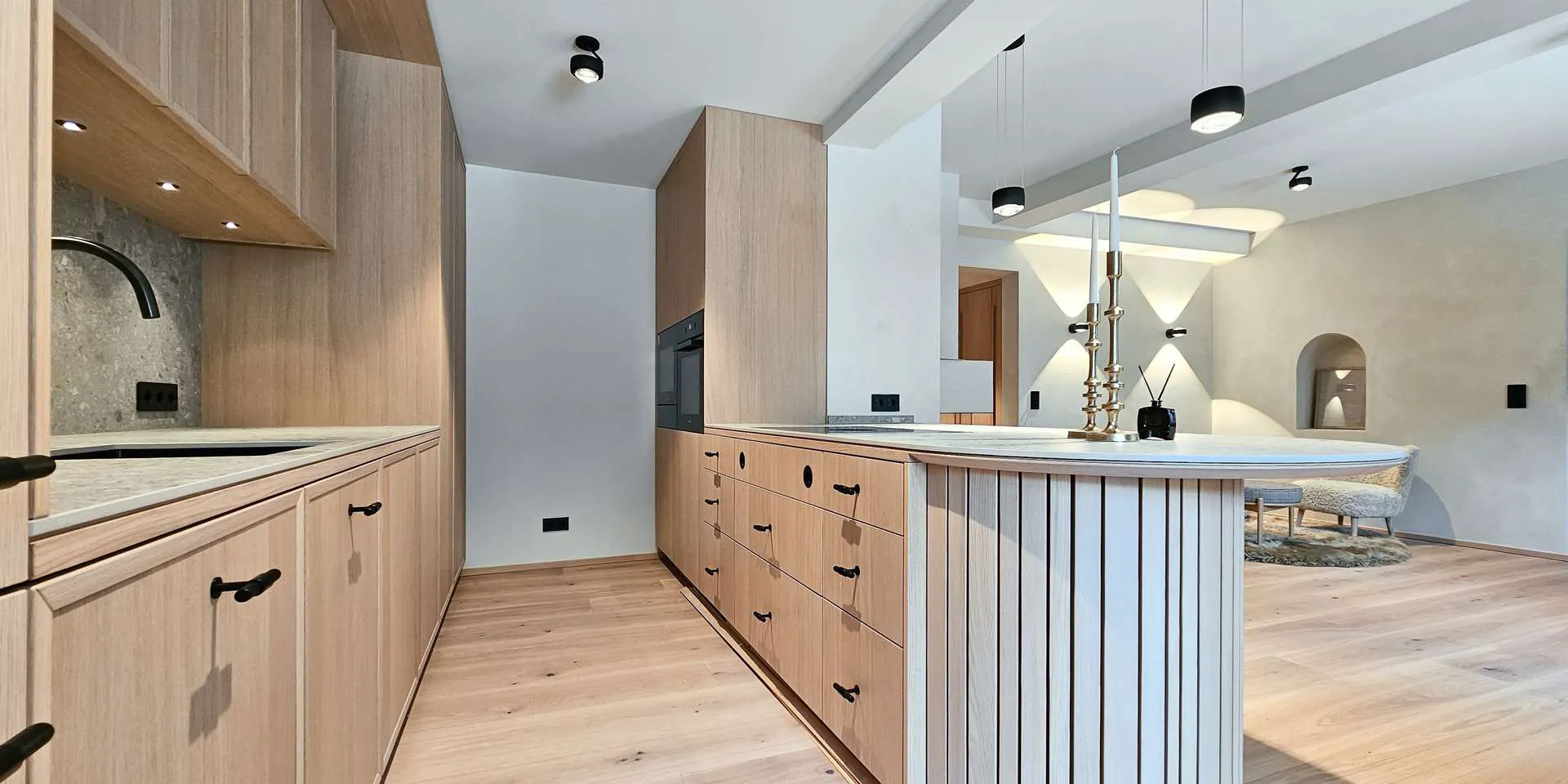 Die gesamte Wohnung ist mit hochwertigen Schreiner Möbeln im Wert von 180.000€ ausgestattet. Die Gubi-Möbel in Kombination mit den Seide Wolle Vorhängen verleihen der Wohnung das Gefühl, angekommen zu sein.
