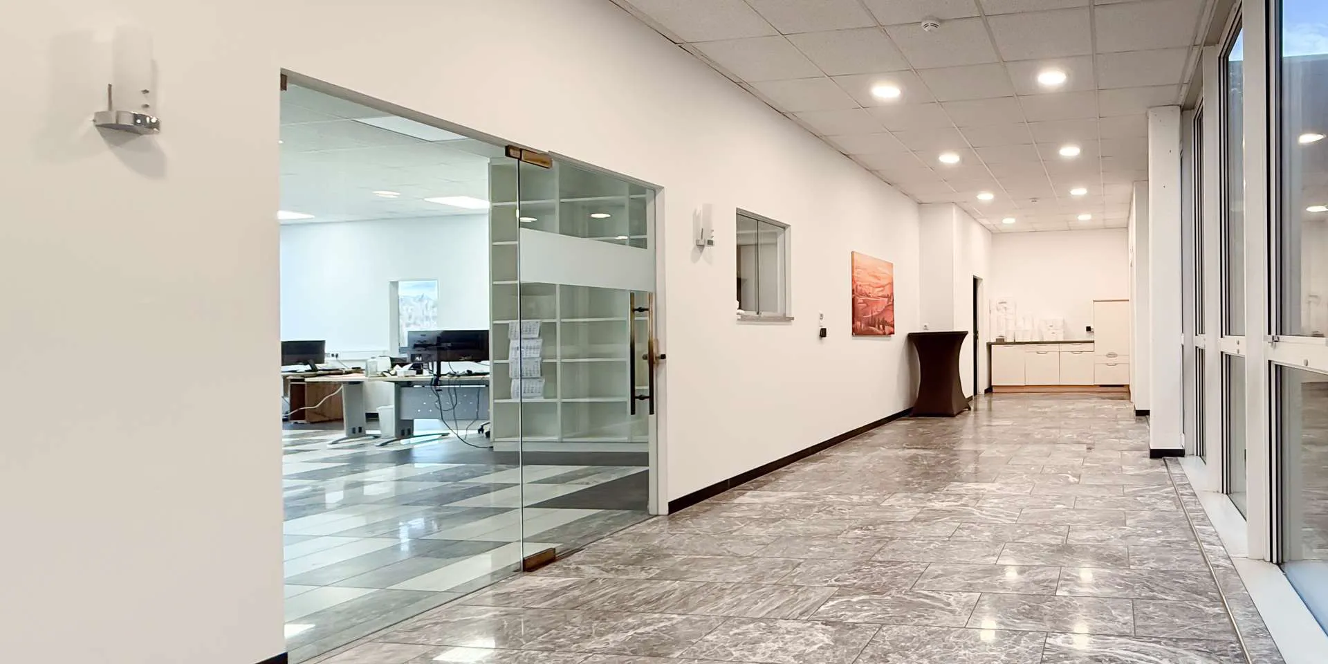 Dank Ecklage sind 2 der 4 Seiten vollverglast und gewähren optimale Belichtung. Für eine dauerhafte, gute Arbeitsleistung steht Ihnen ein Glasfaseranschluss zur Verfügung. Das Büro weist einen guten Grundriss auf, welcher einem Rechteck ähnelt. Im gleichen Geschoss befinden sich ein ca. 40m² Empfangsraum, als auch ein WC. Die abgehängte, mit Akustikplatten verkleidete Decke trägt maßgeblich zu einem besseren Raumklang bei. Die Raumhöhe von 2,90m lässt den Raum noch offener und größer wirken.