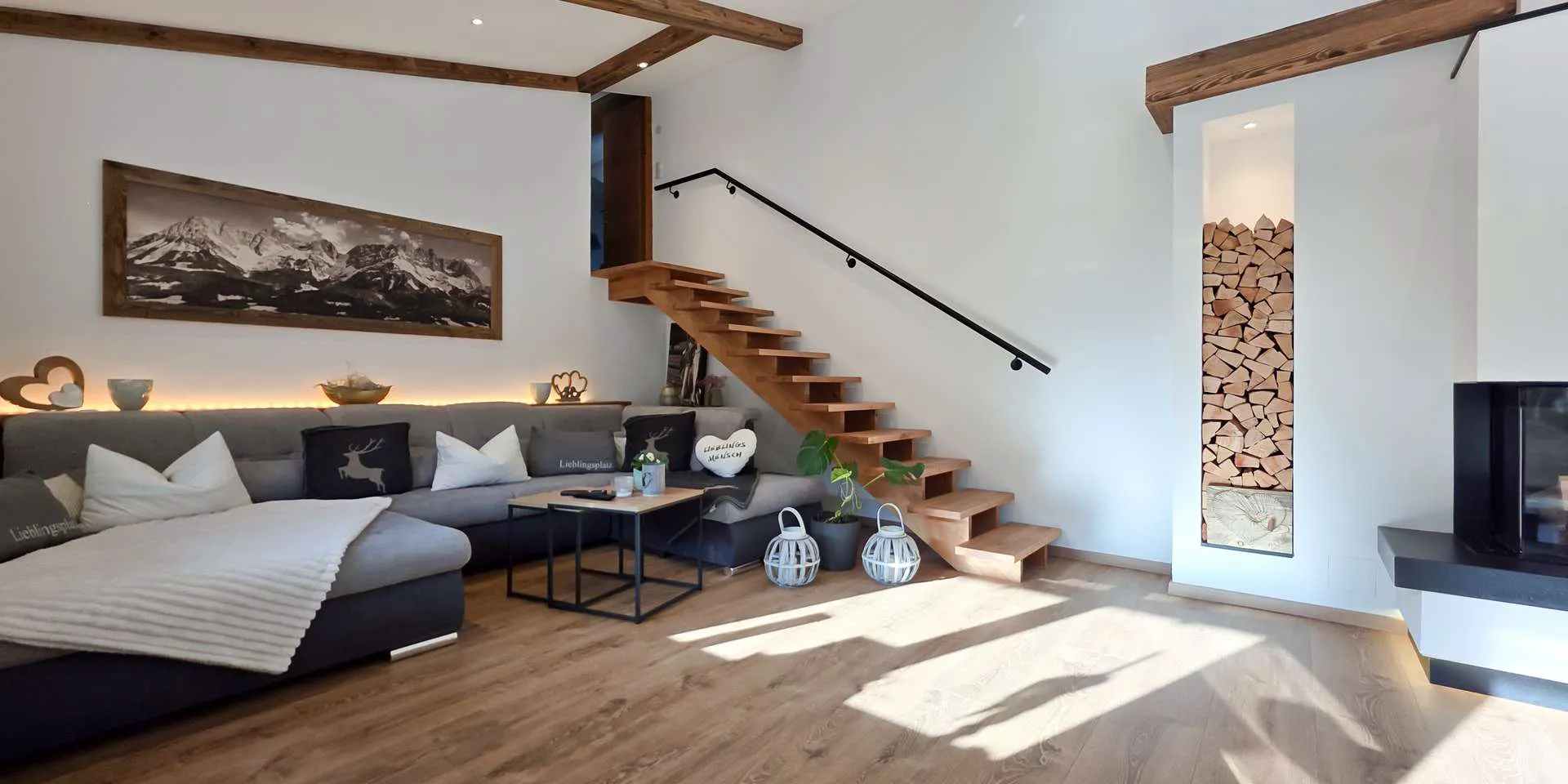 In der nördlichen Haushälfte befindet sich die 130m2 große Wohnung 3 mit darunter liegender Garagen und Lagerfläche, welche 2021 mit Ausnahme des Dachs generalsaniert wurde. Bei dieser Sanierung wurde der Grundriss geöffnet, die Zwischendecke entfernt, Altholz Sparren eingezogen, die Fensterflächen sowie die Außenflächen vergrößert, wodurch ein harmonisches Gesamtkonzept entstand.