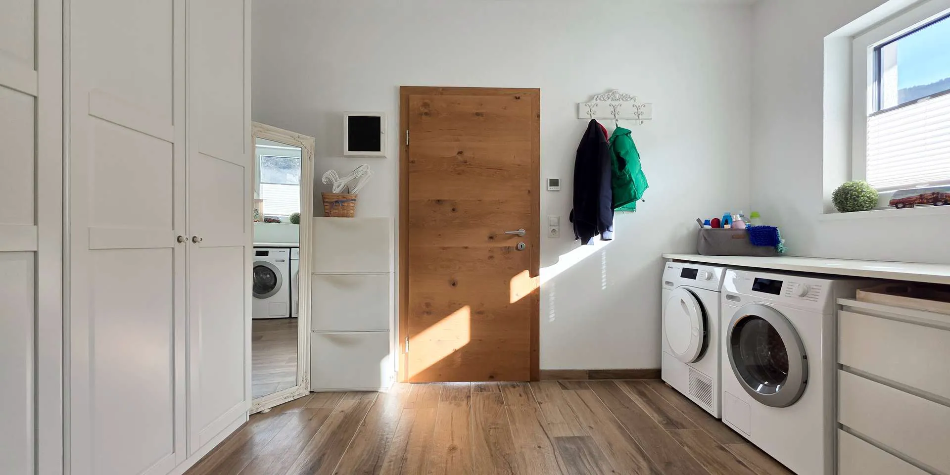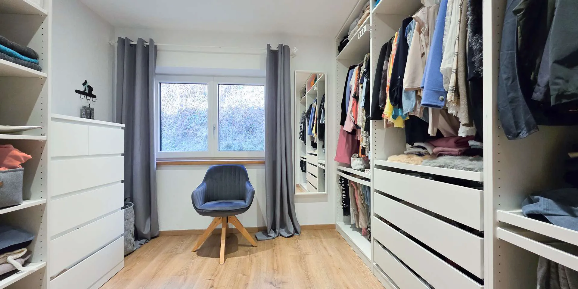 Das Hauptschlafzimmer mit eigenem Schrankraum überzeugt durch eine stylische Altholzwand mit indirekter Beleuchtung und ist äußerst ruhig gelegen. Das großzügige Badezimmer mit XL-Dusche, Wanne und breitem Waschtisch hat neben einem Handtuchheizer und Spots ein uneinsehbares Fenster. Das WC ist separat.