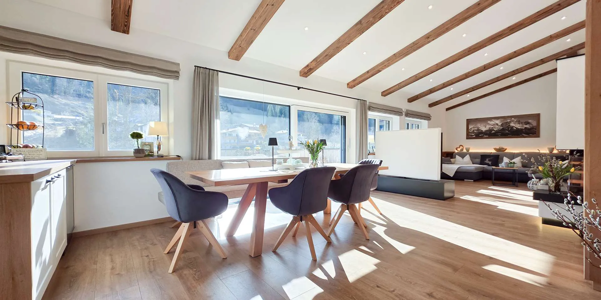 Das Highlight in dieser Wohnung ist der 50m2 große Wohn-/ Essbereich, wo neben dem zentral gelegenen offenen Kamin, der 360 Grad drehbare TV, welcher zusätzlich als Raumtrenner fungiert, platziert wurde. Die angenehmen Beleuchtungselemente und die schwebende Treppe zur Galerie in Kombination mit der überdurchschnittlichen Raumhöhe machen diesen Raum zum Herzstück der Immobilie, wo man sich sofort wohl fühlt.