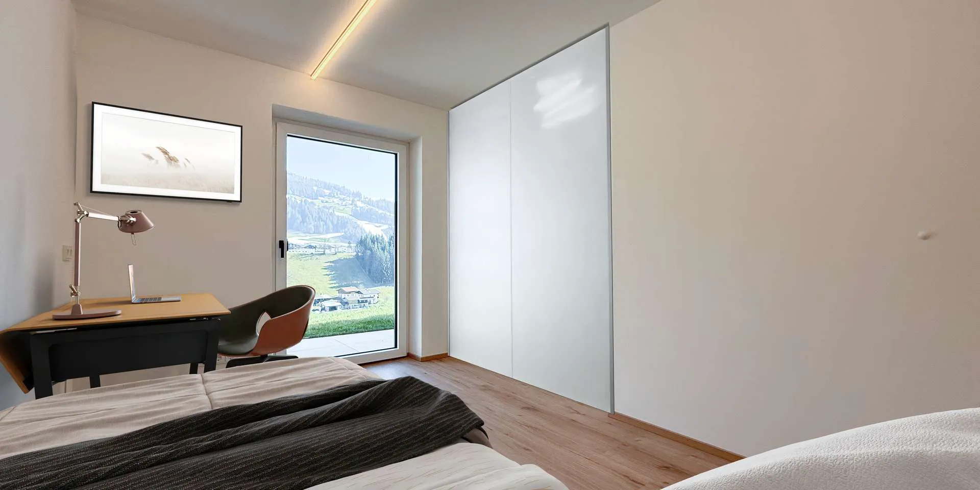 Über den Eingangsbereich auf der Nordseite gelangt man direkt in den Koch-/ Essbereich mit anschließenden Wohnbereich. Die Küche mit Bora und Bosch Geräten wie auch die anliegende Speis wurden von einem lokalen und renommierten Tischlermeister verbaut. Über zwei große Glasschiebeelemente und einer weiteren Dreh-Kipp-Türe ist der knapp drei Meter tiefe Balkon Südbalkon erreichbar mit Blick Richtung Westendorf, dem Kitzbüheler Horn, der Choralpe und dem Windautal. Als echter Hingucker rundet ein goldenes Gäste-WC diese Ebene ab.