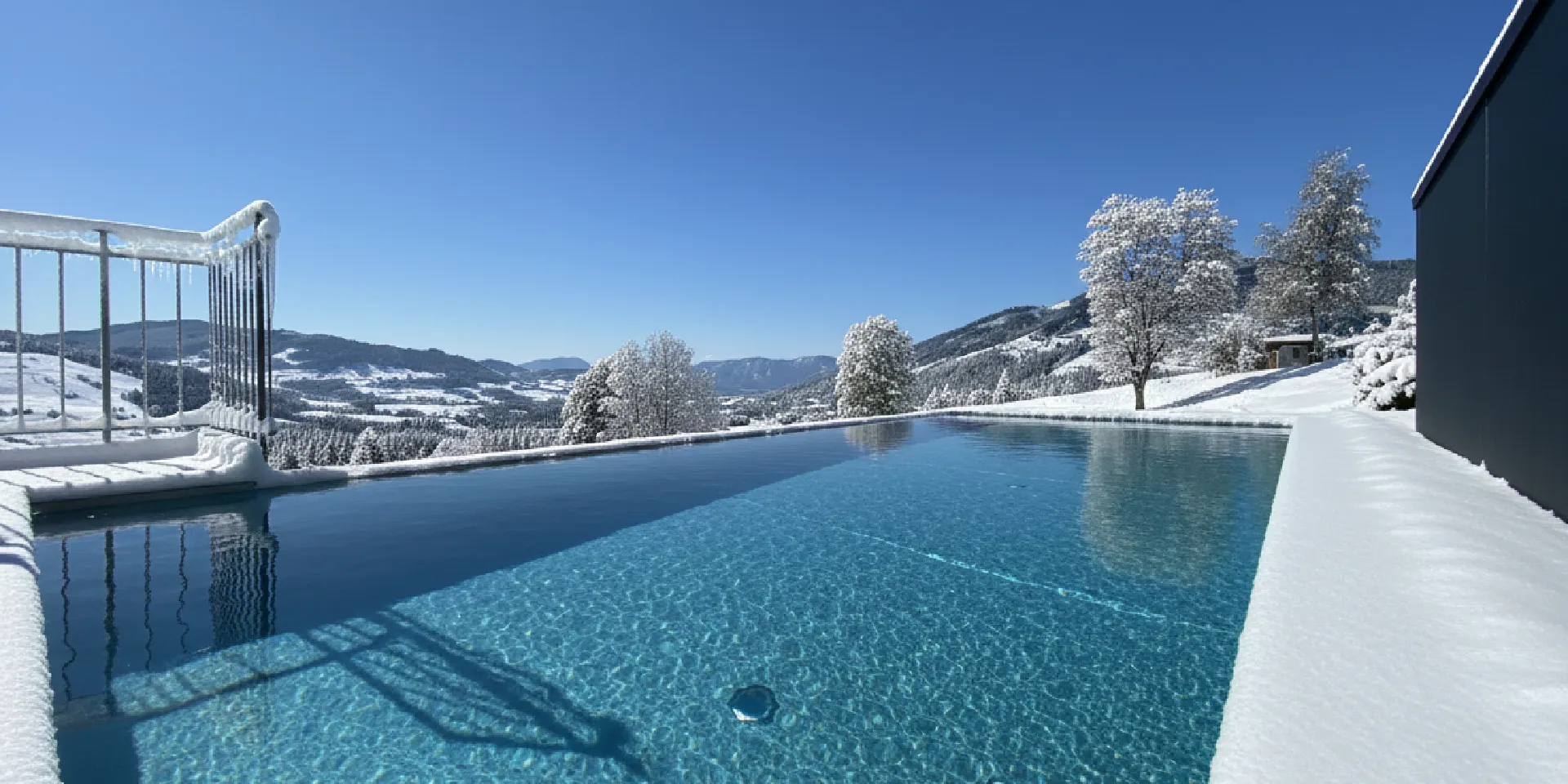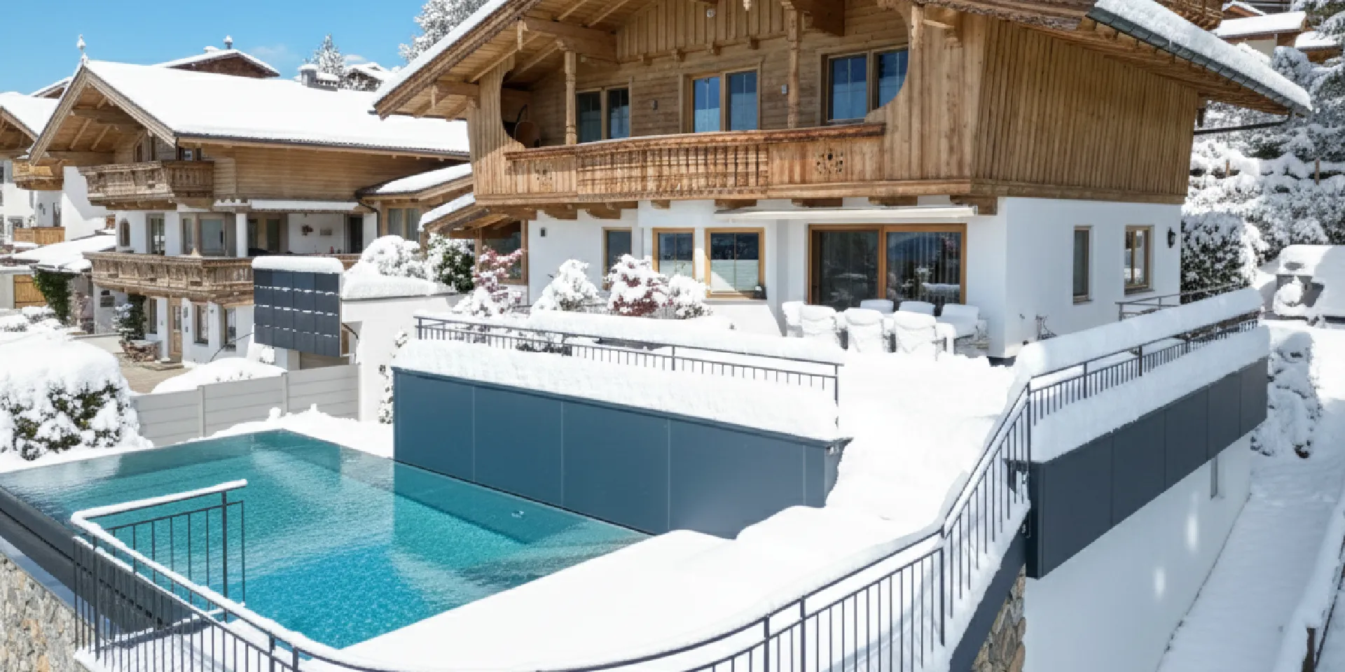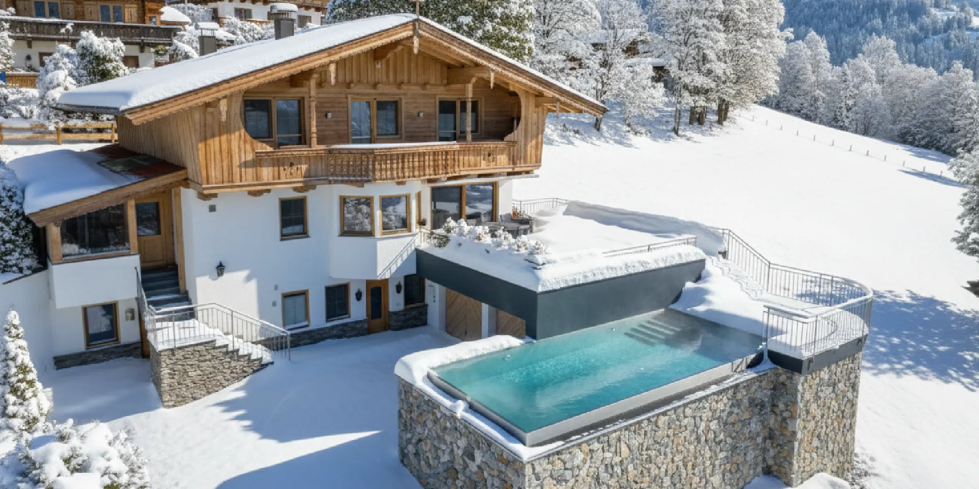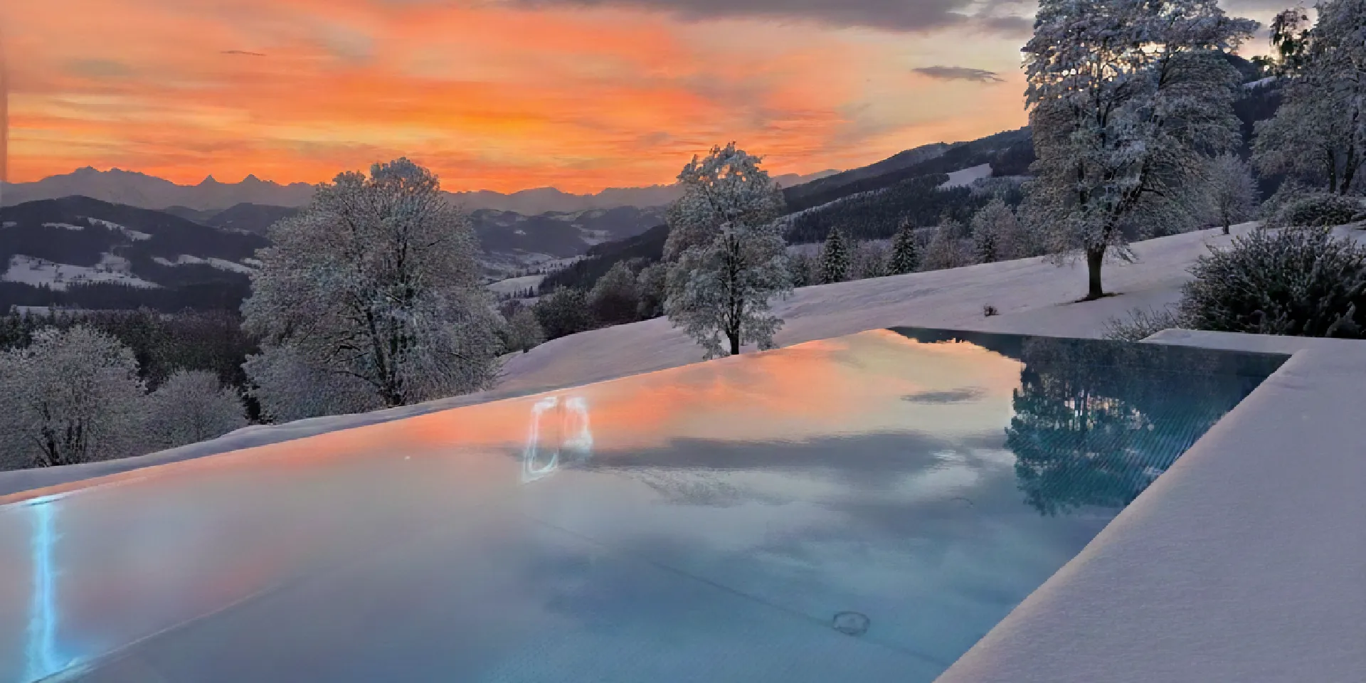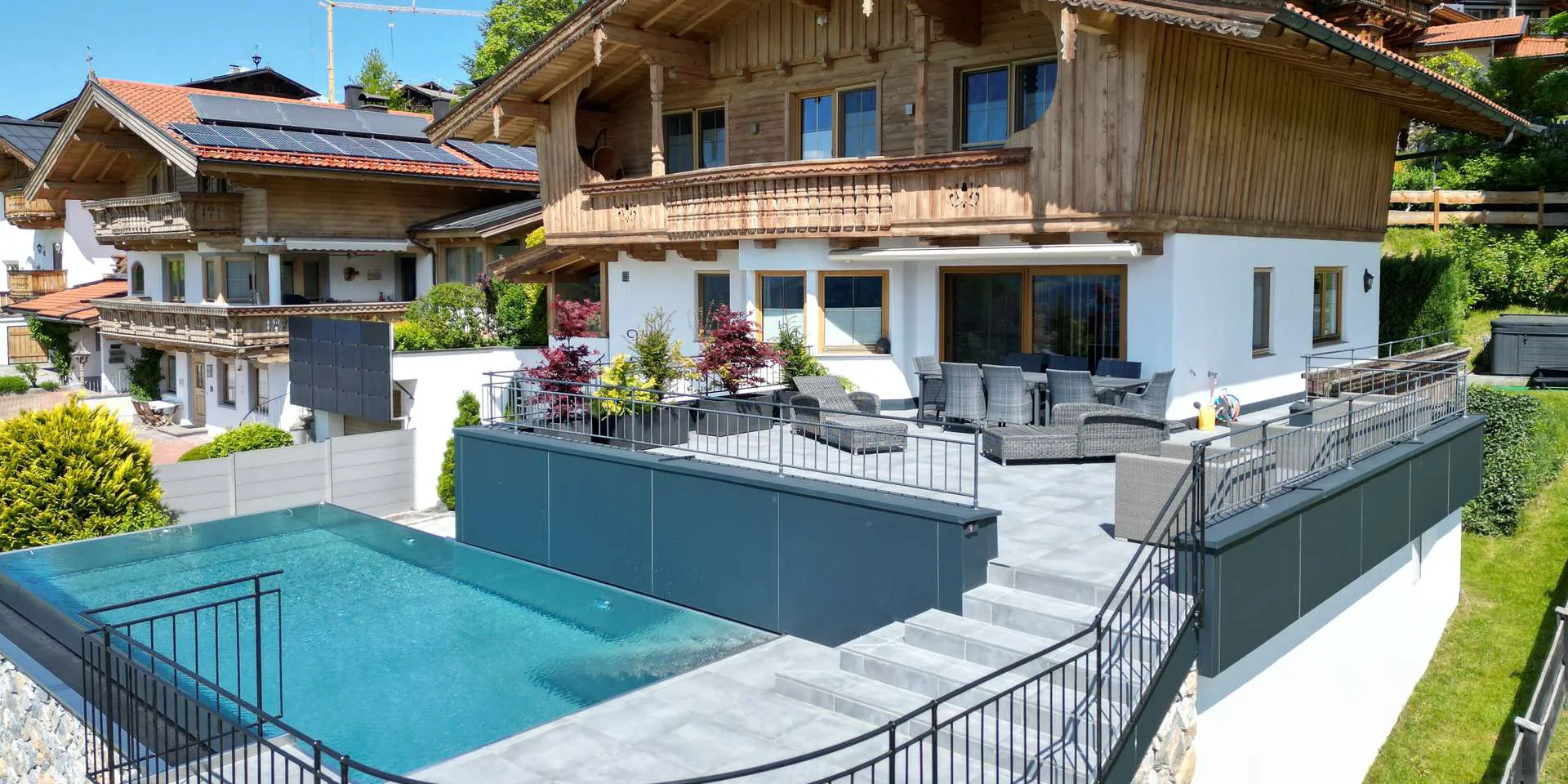 Über ein großes Schiebeelement gelangen Sie auf die 56m2 große, nahezu quadratische, neu verkleidete Südwest Terrasse, wo sofort klar wird, dass es sich um etwas ganz besonderes handelt. Ein majestätischer Blick, wie man ihn nur von Aussichtsplattformen kennt! Dem nicht genug, funkelt davor das Wasser eines 8,0m × 3,5m großen Double-Edge Infinitypools mit Gegenstromanlage, Beleuchtung und Heizmöglichkeit.
