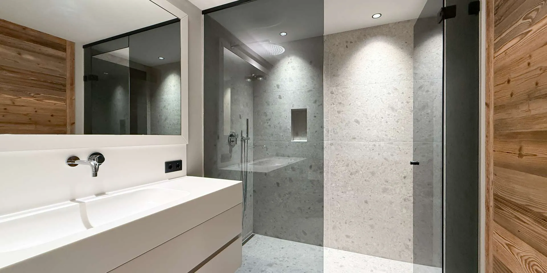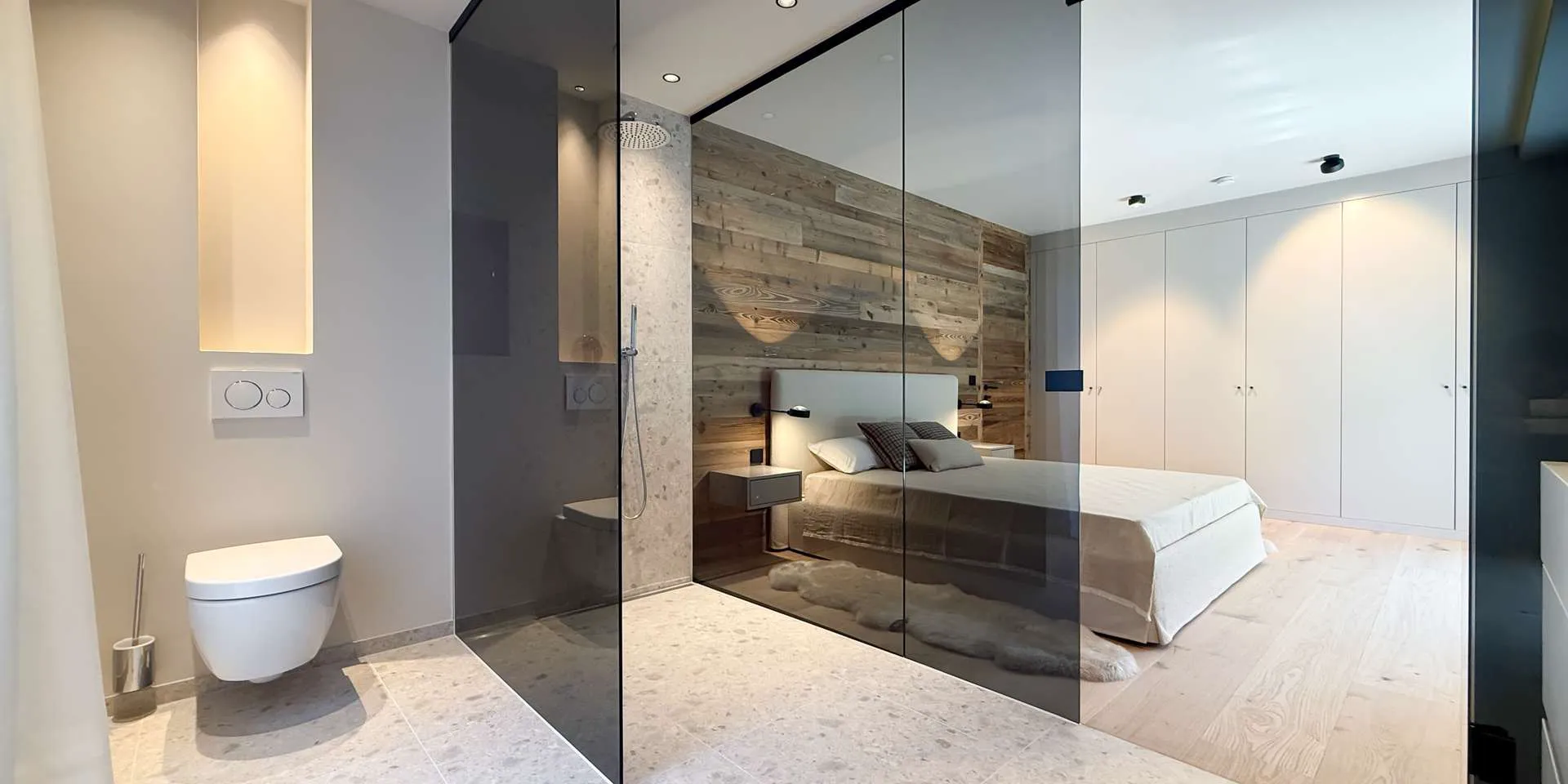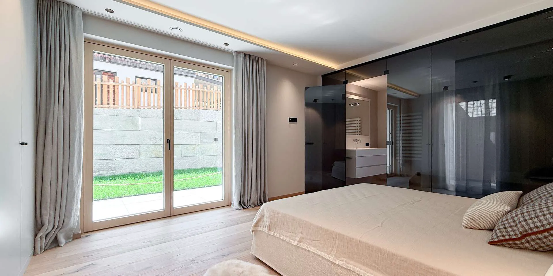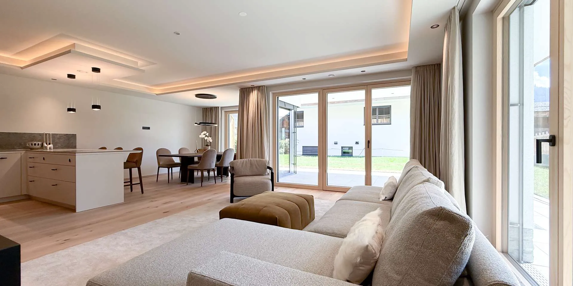 Bereits bei der massiven Altholz Eingangstüre sowie der Altholzinnentüren wird die Qualität der Ausstattung klar. Diverse Schreiner Einbaukästen, ein Loxone System, der offene Kamin, die Occhio Lampen und die Profi-Küche sorgen neben den sorgfältig ausgewählten Oberflächen für maximales Wohlbefinden.
