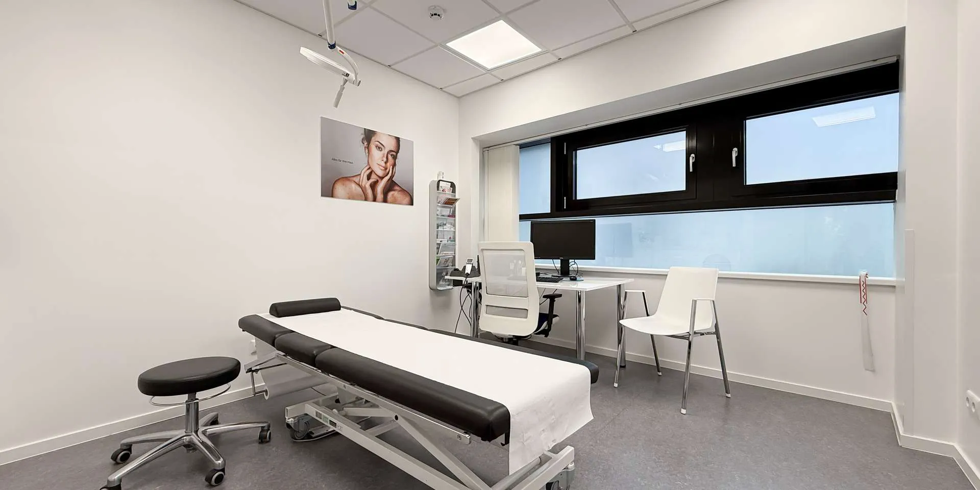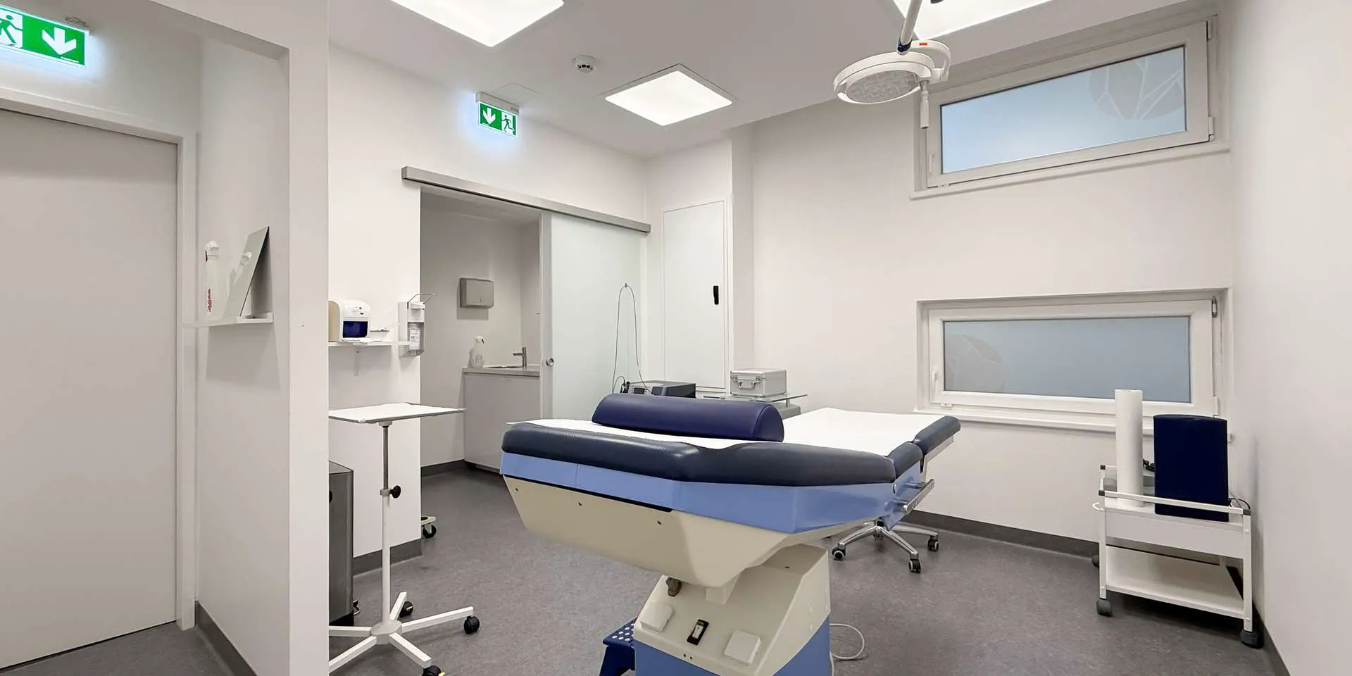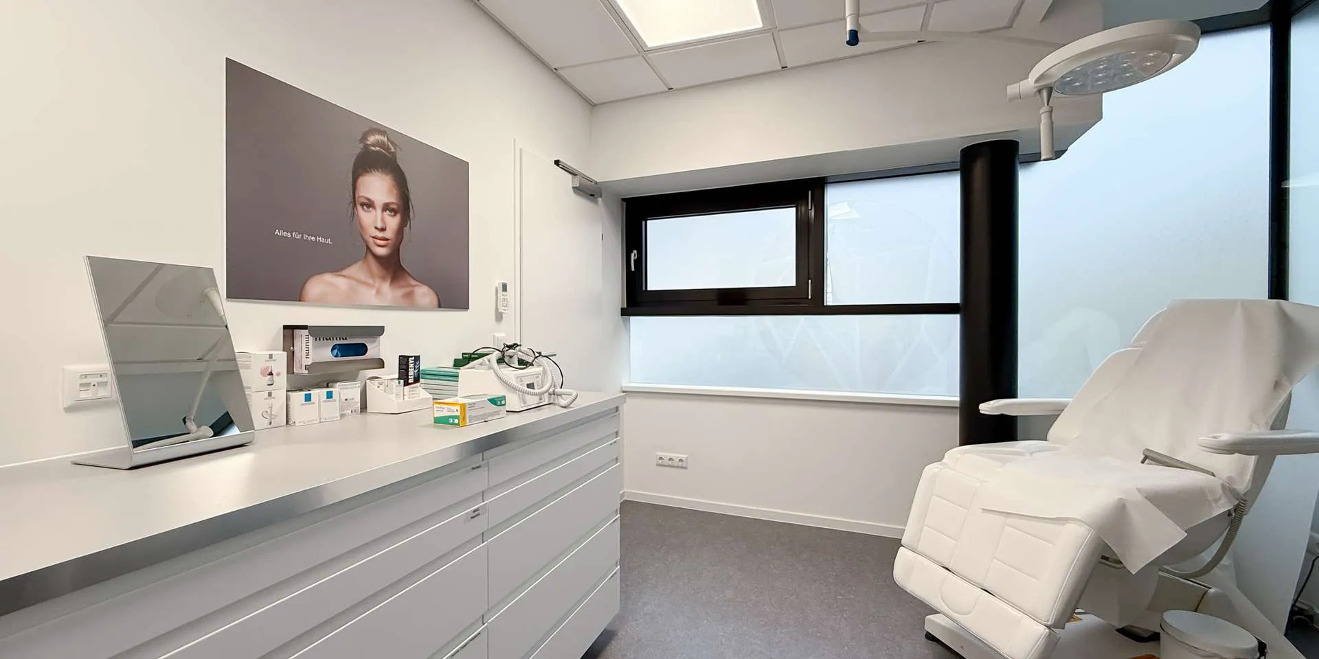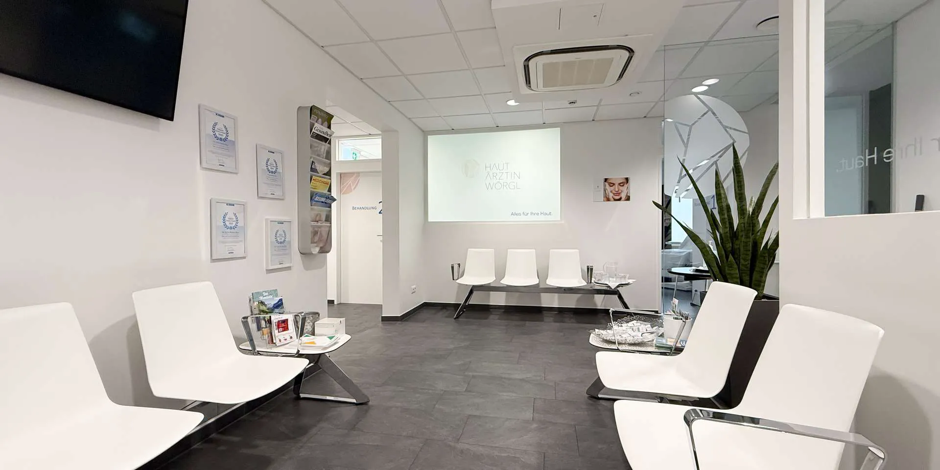 Der Wartebereich bietet Sitzplätze für bis zu 16 Personen, sowie Zugang zu den Zimmern. Hinter dem Anmeldetresen befindet sich ein Aufenthaltsraum für Mitarbeiter sowie ein Badezimmer mit WC und Dusche. Das barrierefreie WC für Kunden/Patienten befindet sich im Anschluss zum Anmeldebereich.