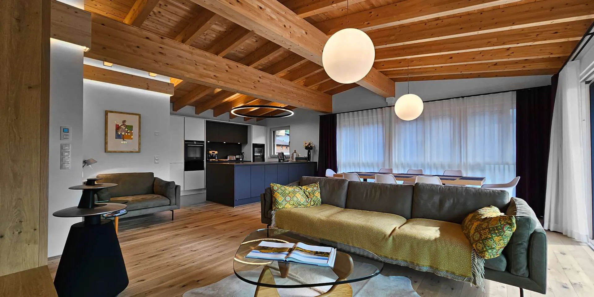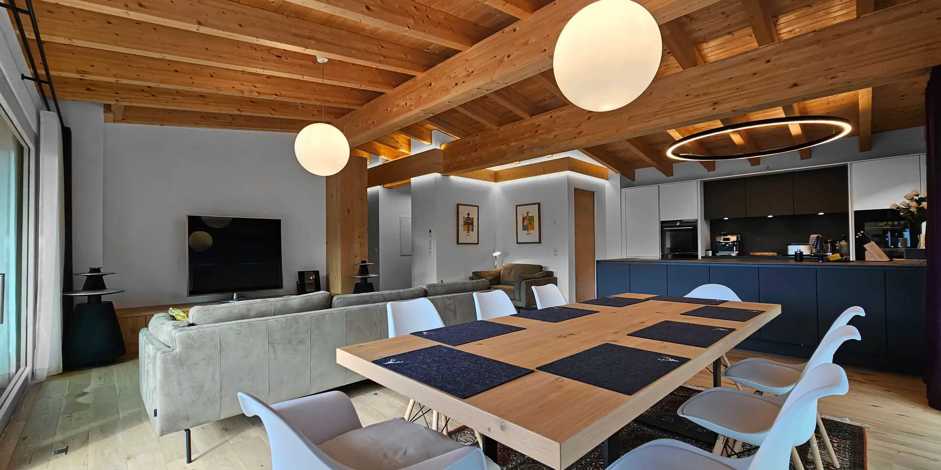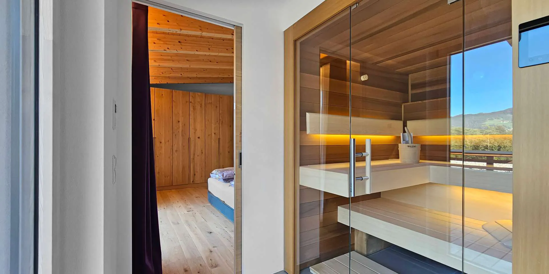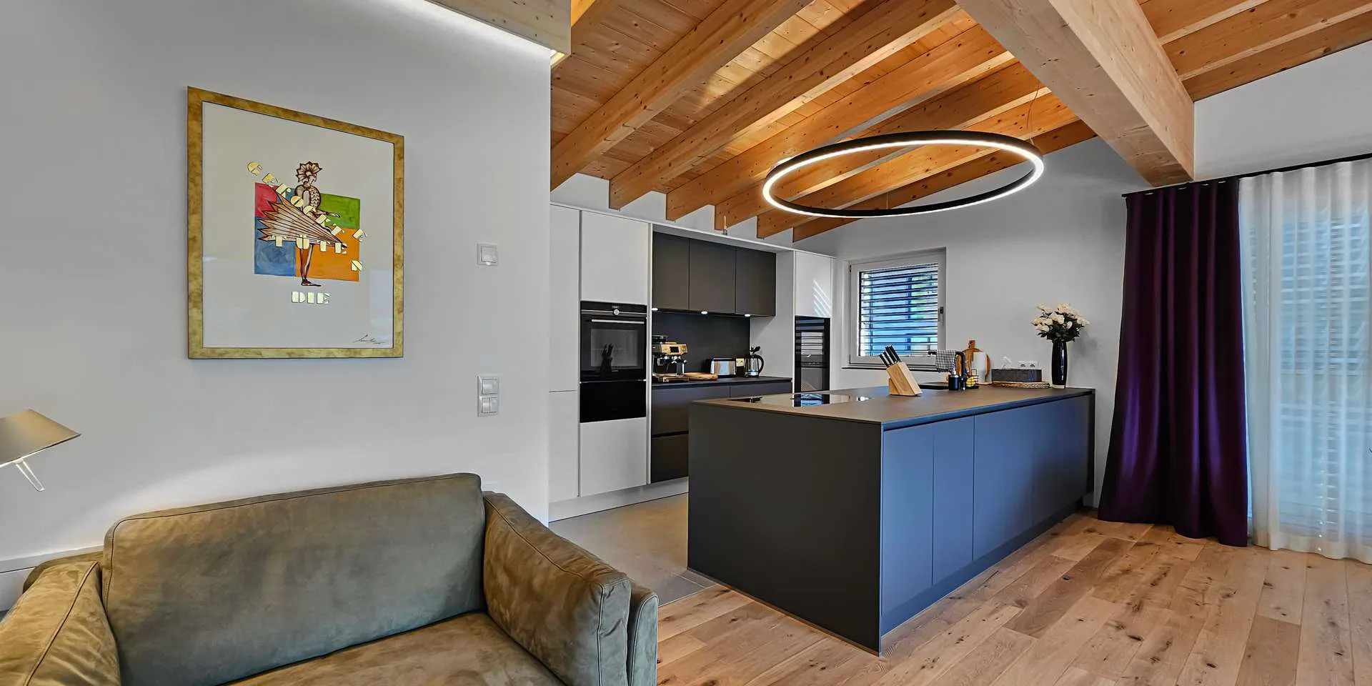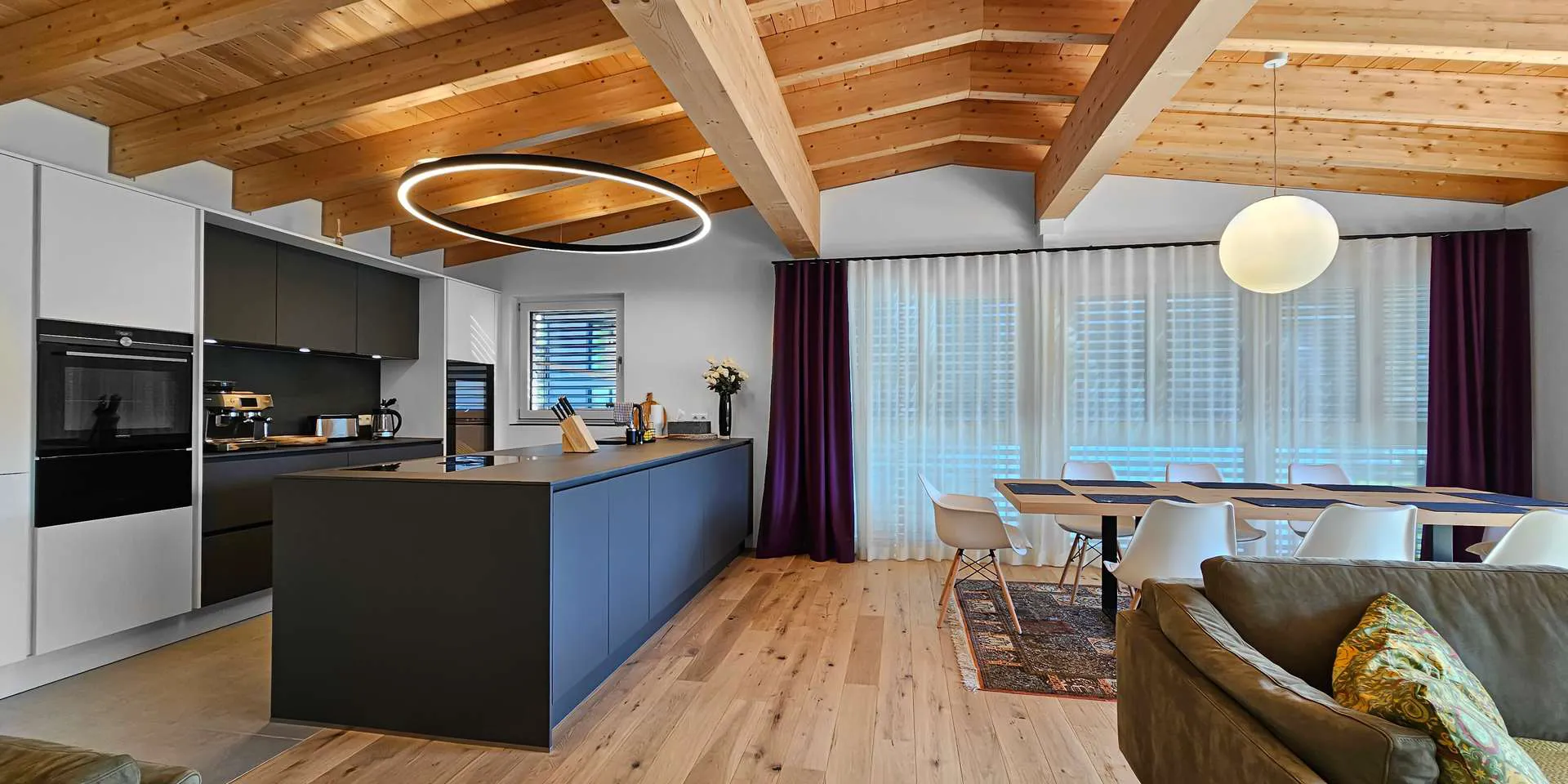 Unterfangen wird dieses Konzept von einem High-End B&O Surroundsystem mit B&O Lab, welche sich an die Umgebung anpassen. Für heiße Sommertage stehen Ihnen in der gesamten Wohnung Raffstores zur Verfügung, welche die Wohnung kühl halten. Weiter wurde ein BUS-System verbaut, mit welchem Sie die Heizung, die Raffstores, die Sauna, die Hauseingangstür mit Video-Gegensprecheinrichtung und den Rauchmelder ansteuern können.