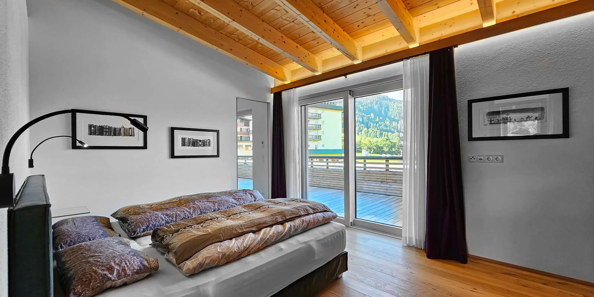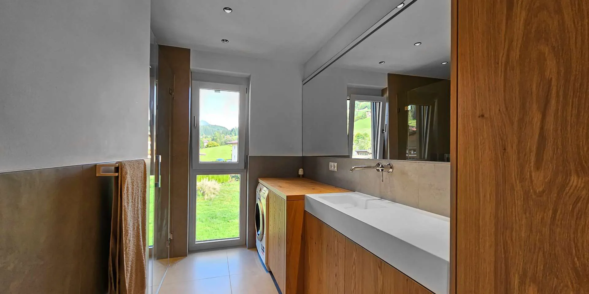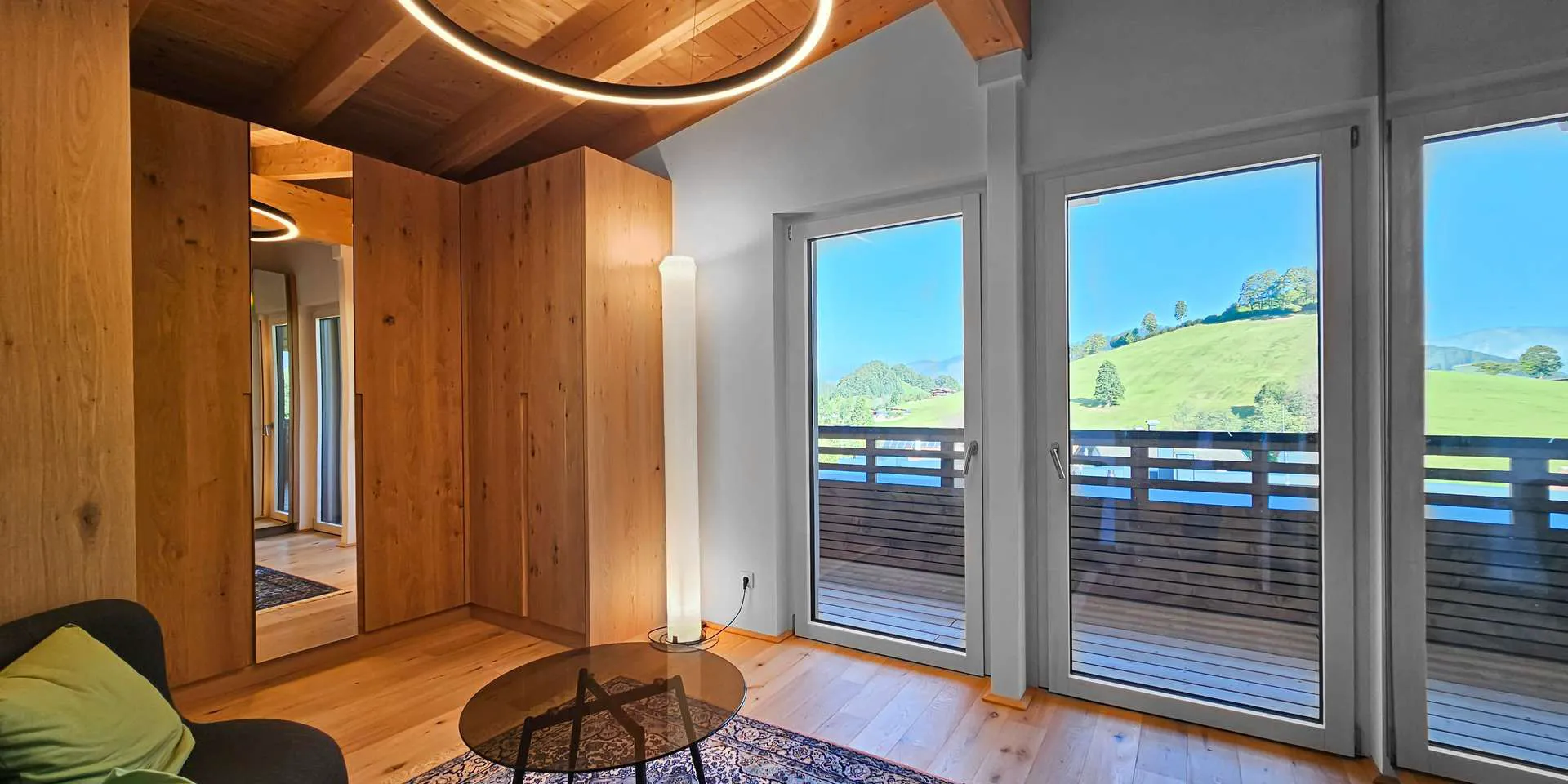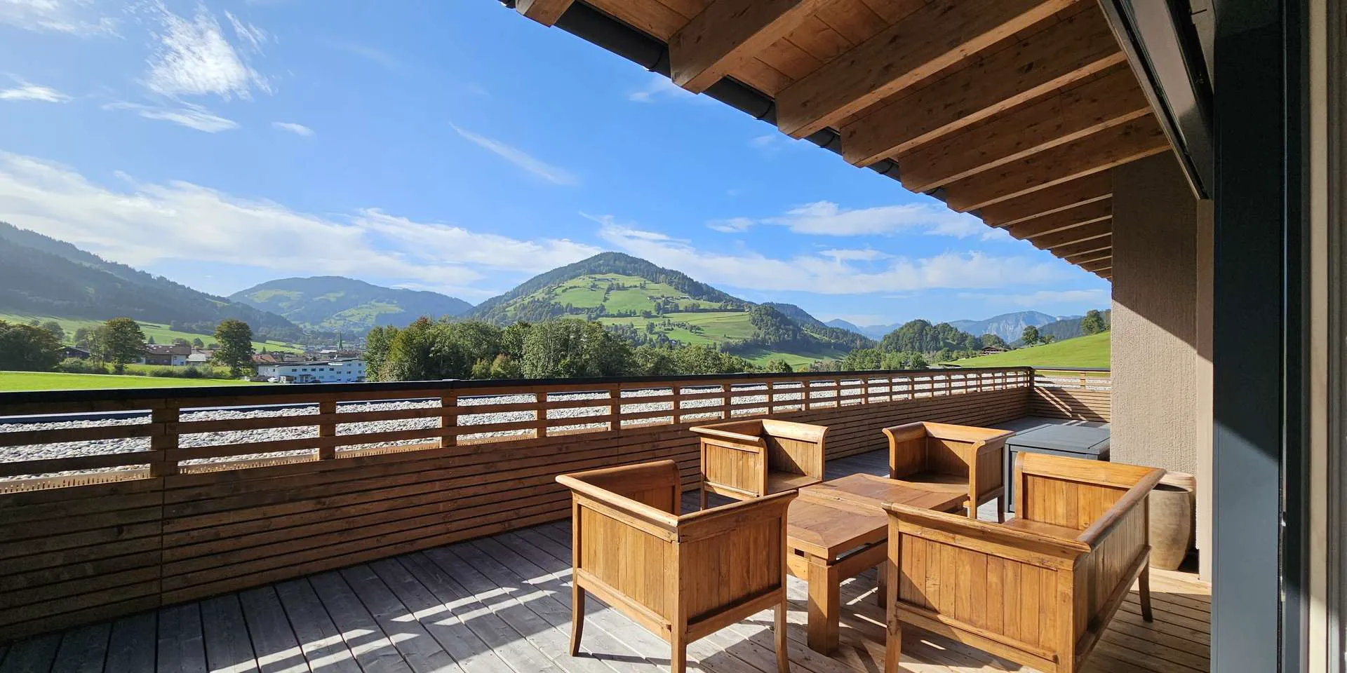 Von diesem Bereich gelangen Sie über die XL Holz-Alu Schiebetür auf die 69m2 große Südwest Terrasse mit grandiosem Weitblick. Der Blick führt über das Ortszentrum von Niederau bis hin nach Oberau, welche in sanfte Grasberge eingebettet sind. Auf der Terrasse befindet sich eine elegante Sitzgruppe aus original balinesischem Teakholz.