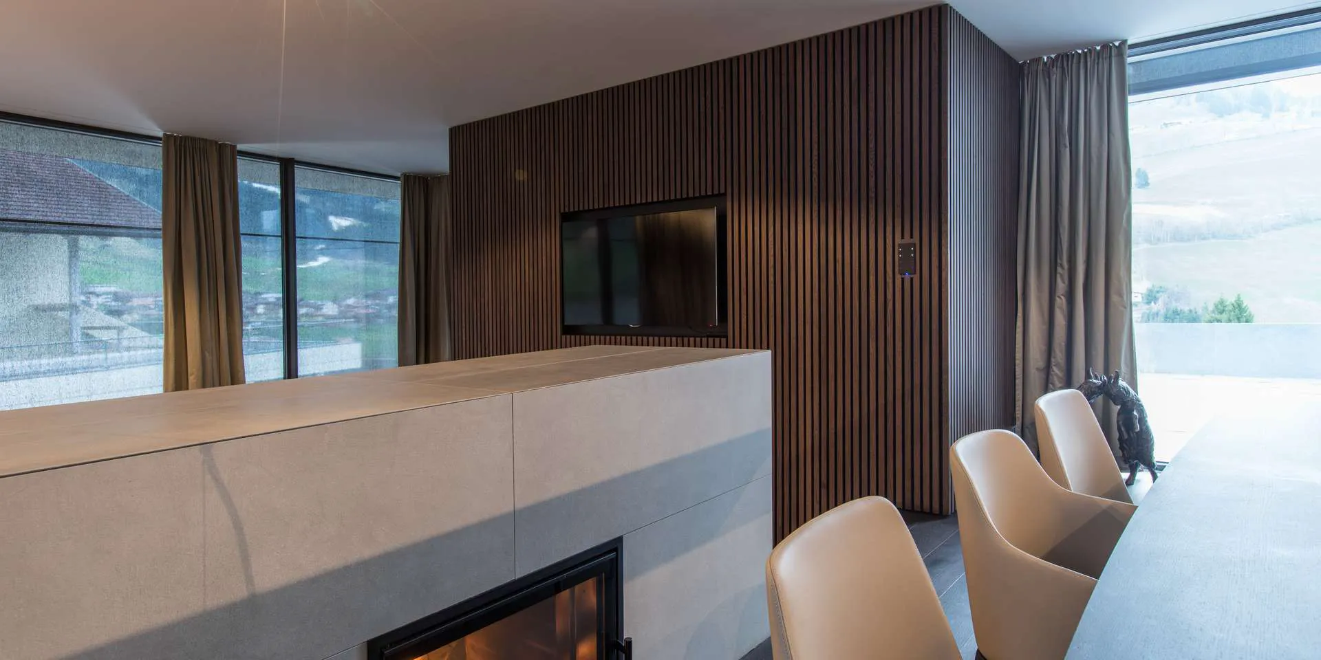 Das Gebäude wurde mit einem KNX-System und einer Sprachsteuerung ausgestattet, wodurch sich Verschattungen, Beleuchtungen, Audio, Heizung aber auch Kühlung ganz einfach und auch ohne Knopfdruck bedienen lassen.