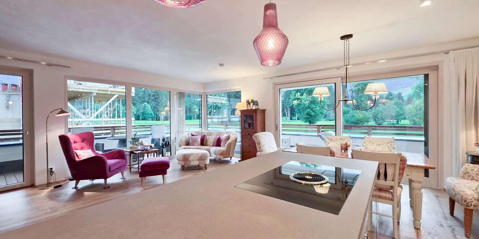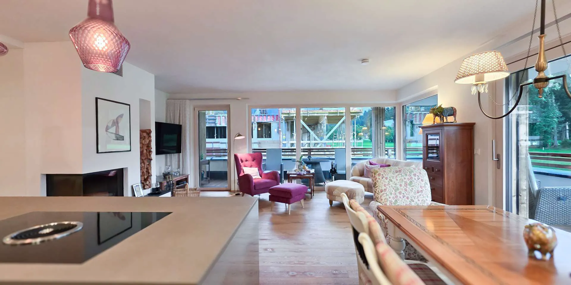 Der Wohn-/Ess-/ Kochbereich wurde mit großen Übereck-Fensterelementen, einem schönen und zeitlosen Dielenboden, einem offenen Kamin und einer Tischler-Einbauküche mit Kochinsel ausgestattet.