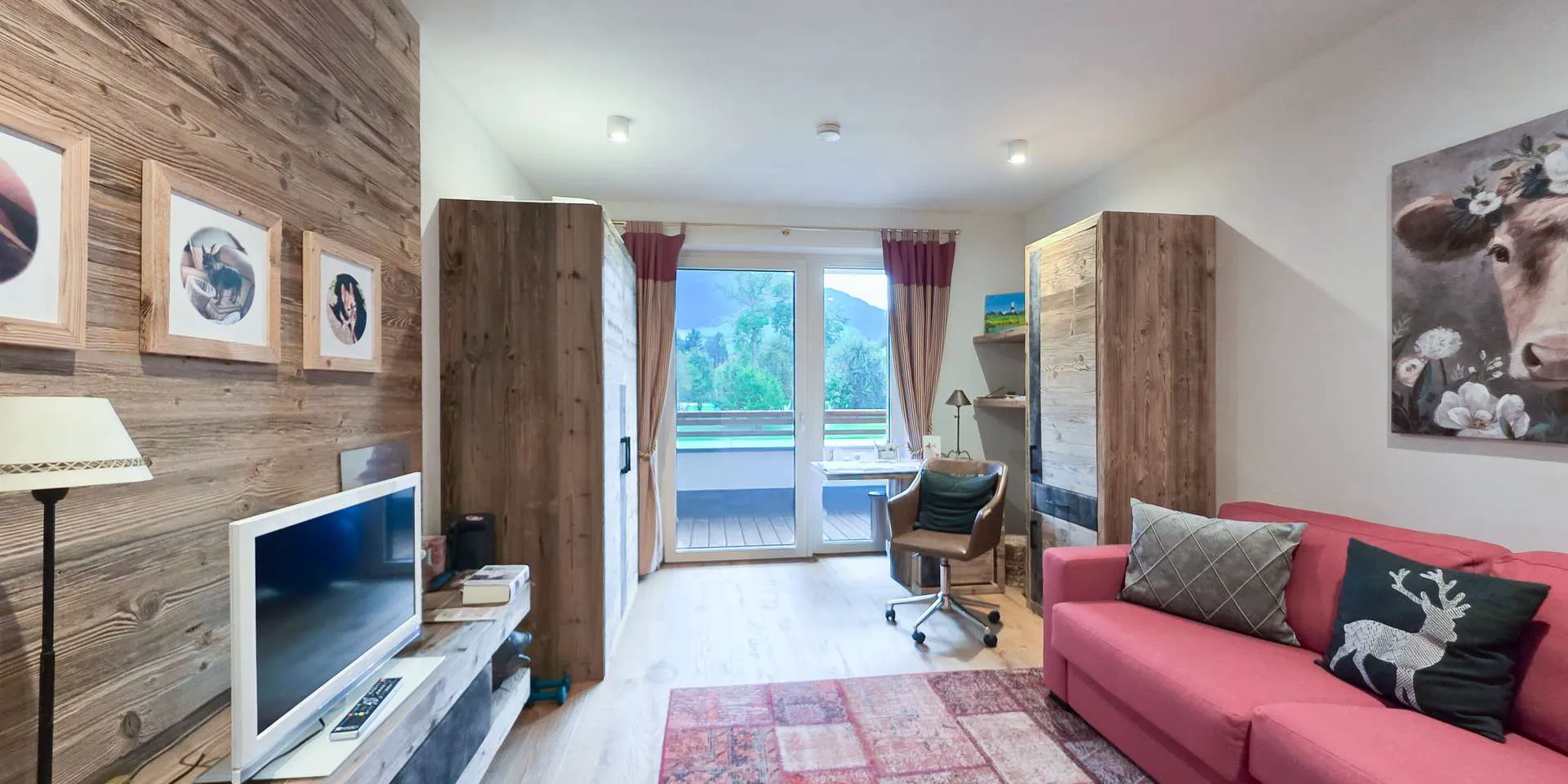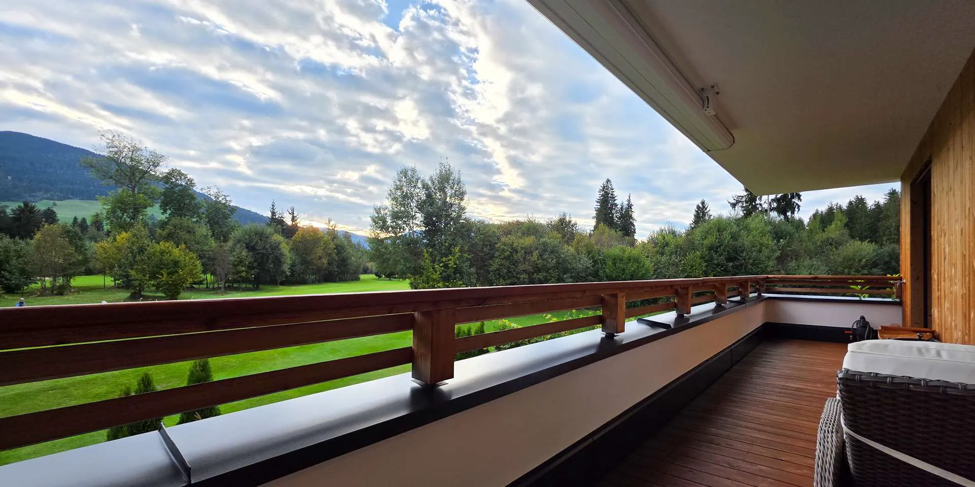 Für ein gutes Raumklima wurde ein Lehmputz verwendet. Zwei Terrassen mit insgesamt 39m2 verbinden Natur und Wohnung. Diese wurden mit Lärchenholz beplankt, wobei die Hauptterrasse atemberaubende Sonnenuntergänge über dem Golfplatz garantiert.