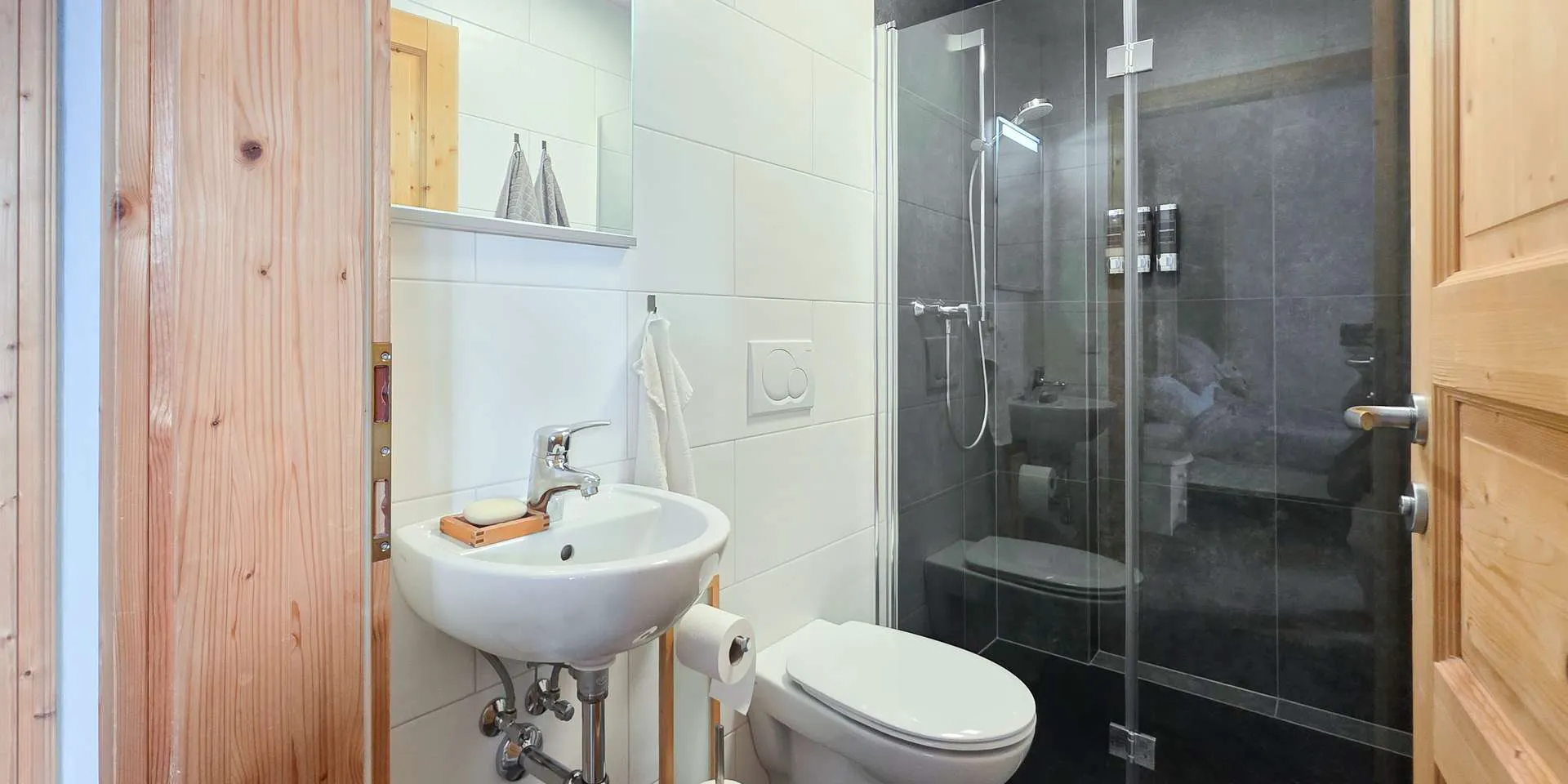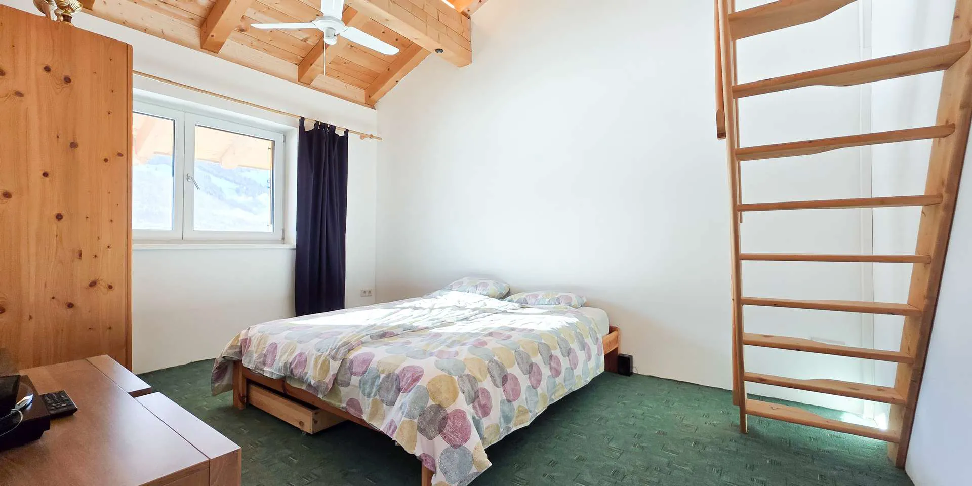 Das Erdgeschoss wurde kürzlich umgebaut, wodurch nun hinter dem 44m2 großen Wohn-/Ess-/Kochbereich eine kleine Einliegerwohnung mit eigenem Badezimmer geschaffen wurde. Ein Küchenanschluss ist in der Einliegerwohnung vorhanden. Das Highlight ist auf dieser Ebene neben dem offenen Kamin die nahezu quadratische, über 40m2 große Südterrasse mit spektakulärem Bergblick.