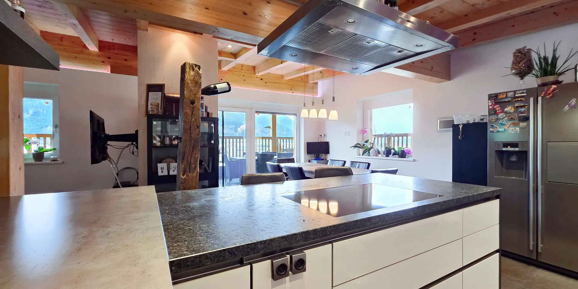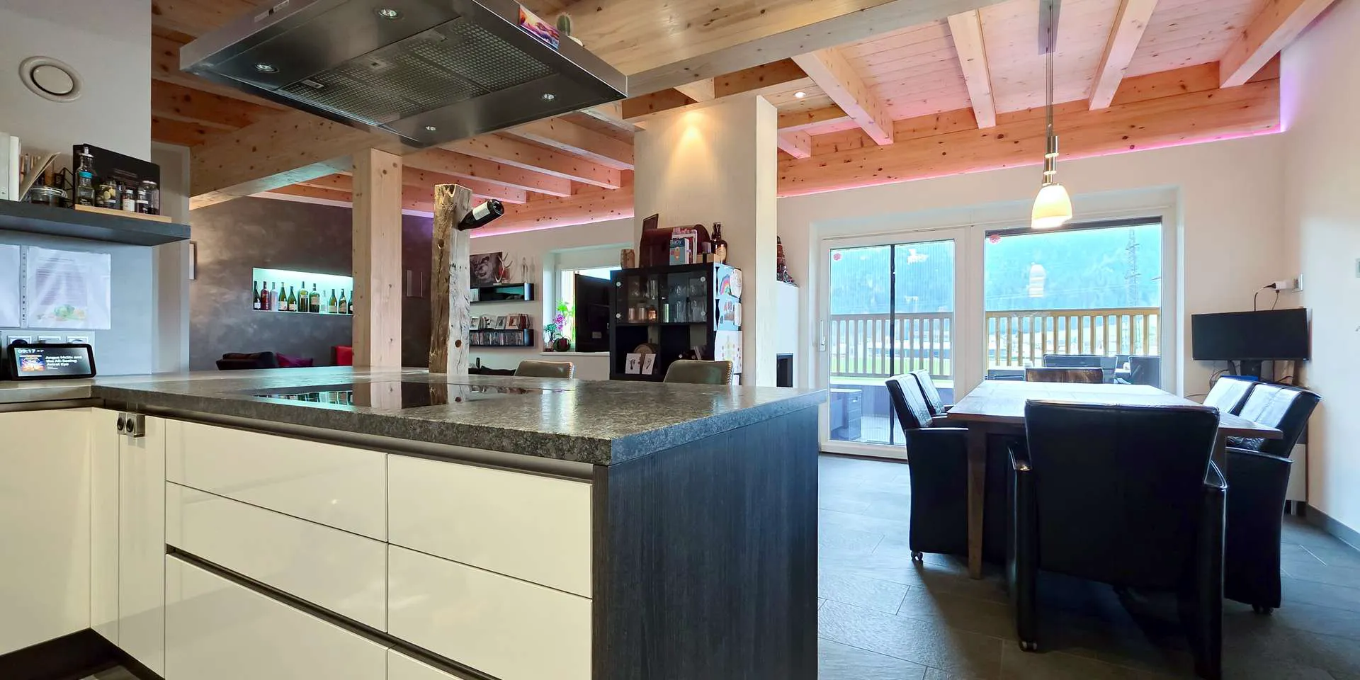 Im Dachgeschoss befindet sich der großzügige Wohn-/ Ess-/ Kochbereich mit Küchenhalbinsel, Sichtdachstuhl und offenem Kamin. Ein WC mit Pissoir wurde ebenfalls auf dieser Ebene untergebracht. Über ein Schiebeelement gelangen Sie auf die 30m2 große und überdachte Terrasse mit Westausrichtung und Panoramablick.