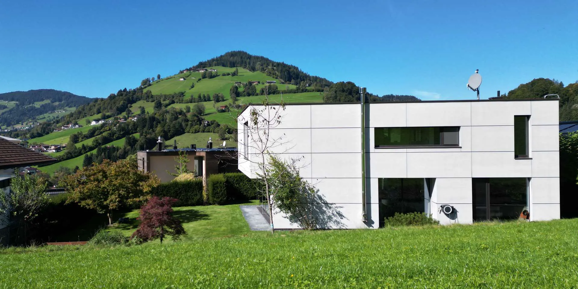 Die zentrale Wohnraumlüftung, die Luftwärmepumpe und die 9,6 kW Peak PV-Anlage machen das sonst schon äußerst energieeffiziente Gebäude nahezu autark.