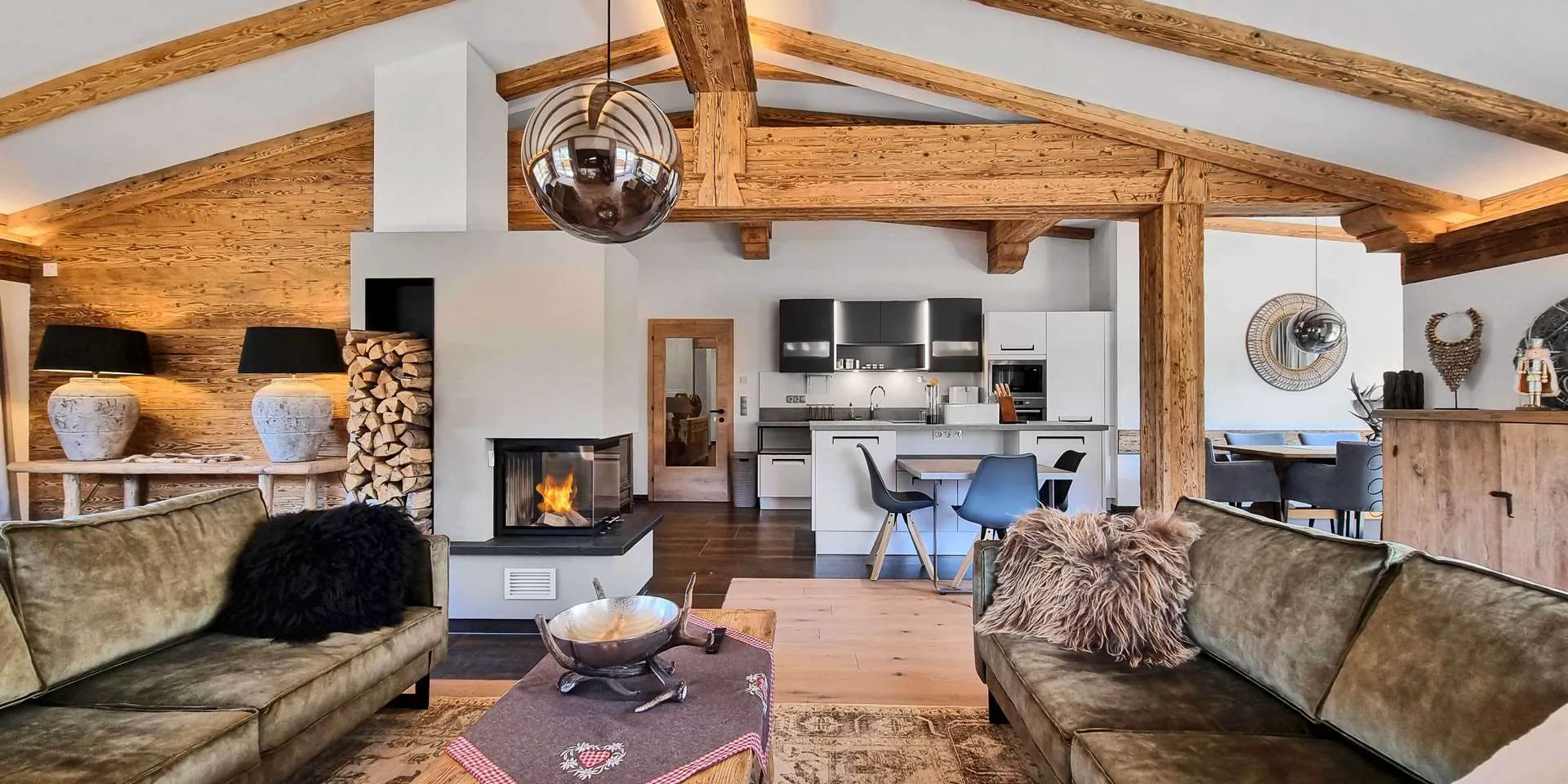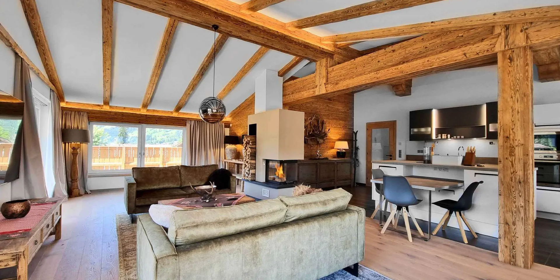 ein. Der zentral positionierte, offene Kamin sorgt für ein angenehmes Ambiente, insbesondere an kalten Wintertagen. Vom Wohnessbereich haben Sie Zugang zu dem südlichen Balkon sowie der südöstlichen & südwestlichen Terrasse.