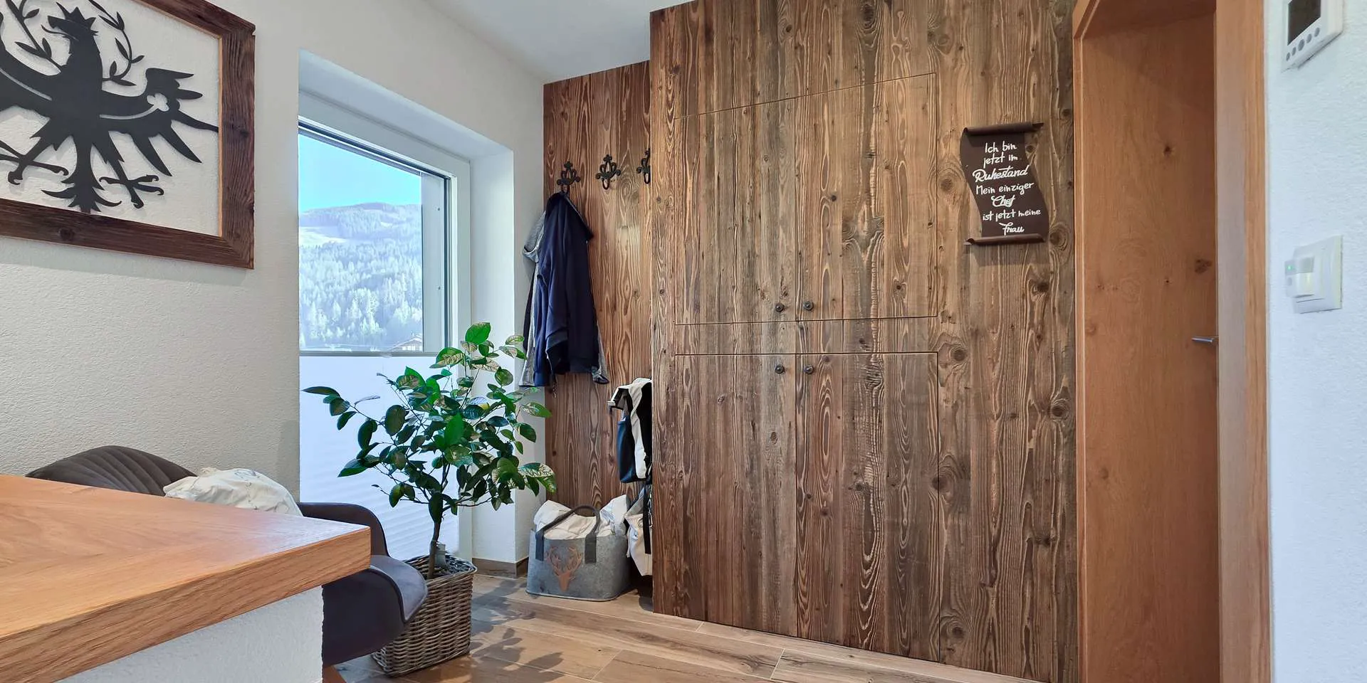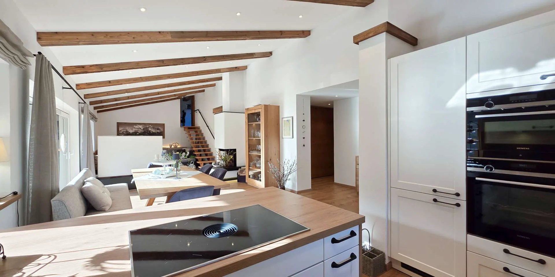In der nördlichen Haushälfte befindet sich die 130m2 große Wohnung 3 mit darunter liegender Garagen und Lagerfläche, welche 2021 mit Ausnahme des Dachs generalsaniert wurde. Bei dieser Sanierung wurde der Grundriss geöffnet, die Zwischendecke entfernt, Altholz Sparren eingezogen, die Fensterflächen sowie die Außenflächen vergrößert, wodurch ein harmonisches Gesamtkonzept entstand.