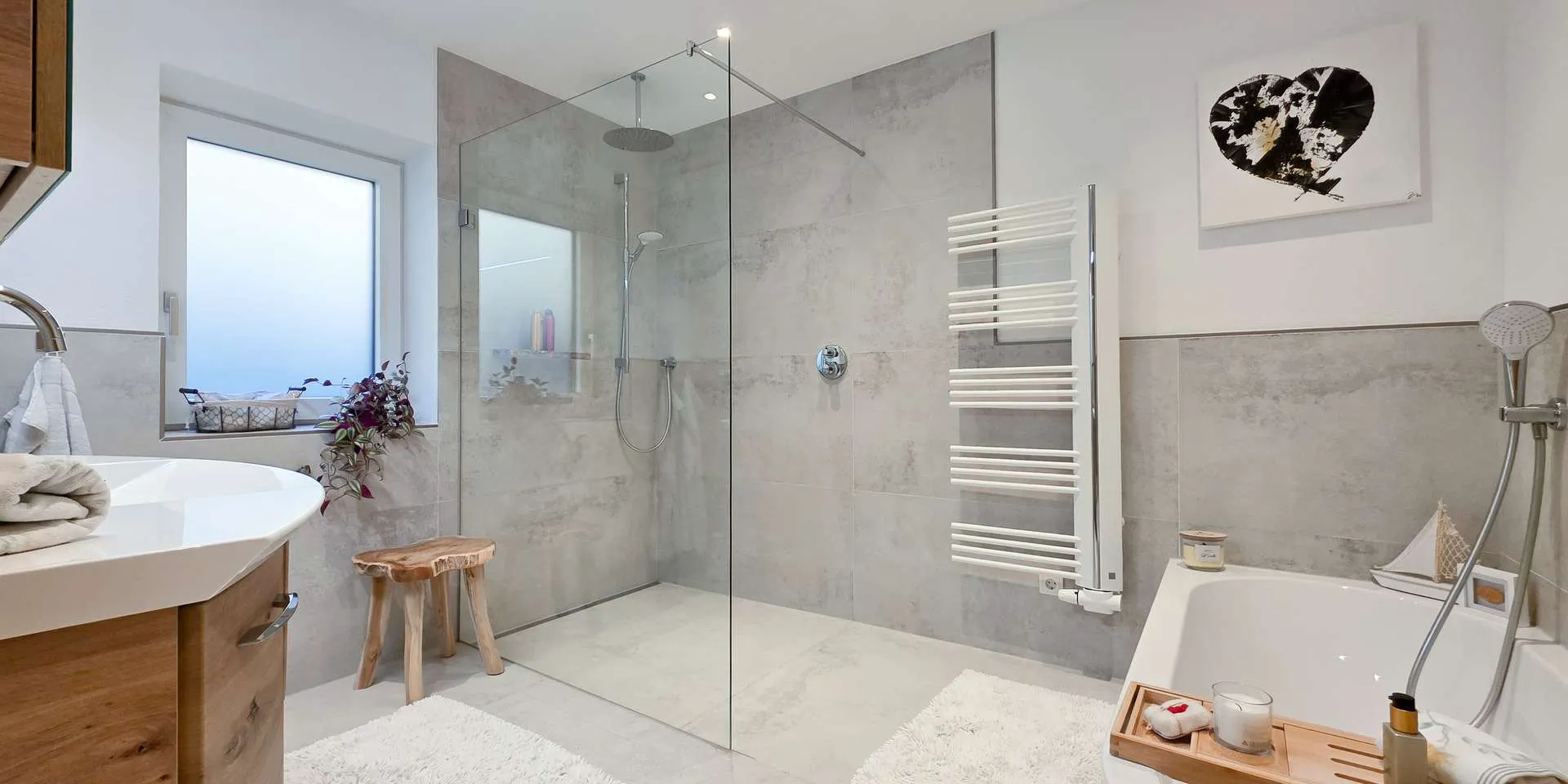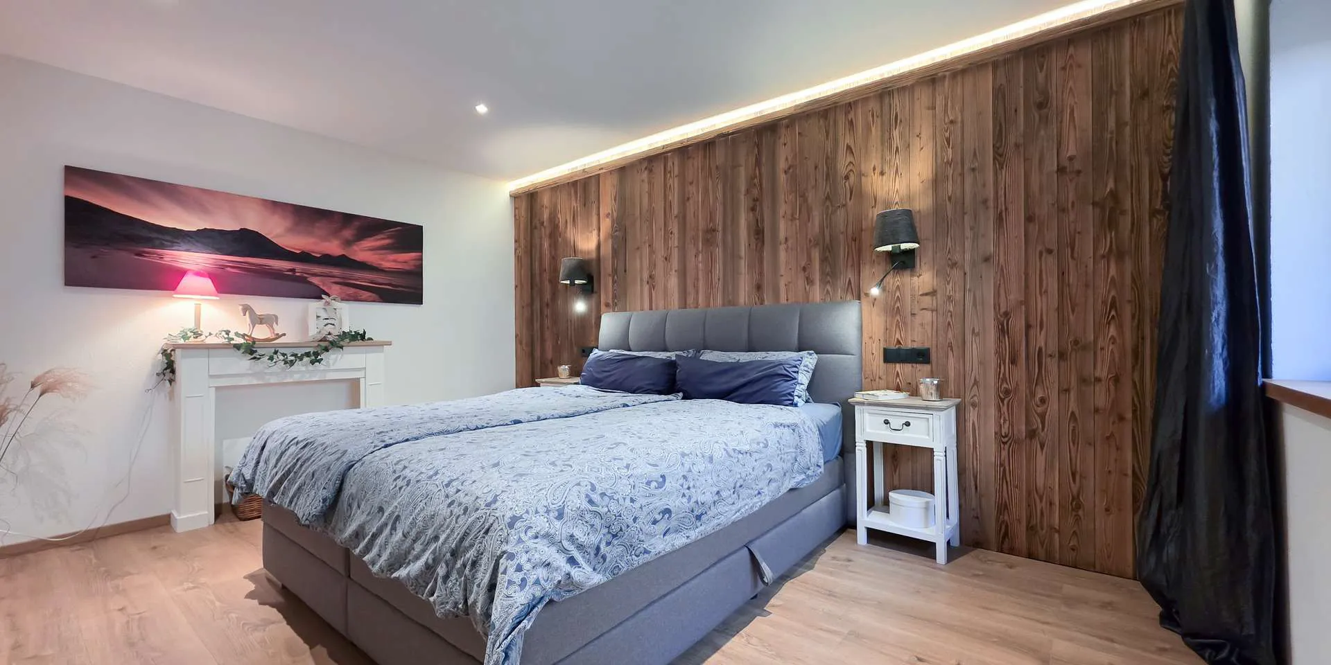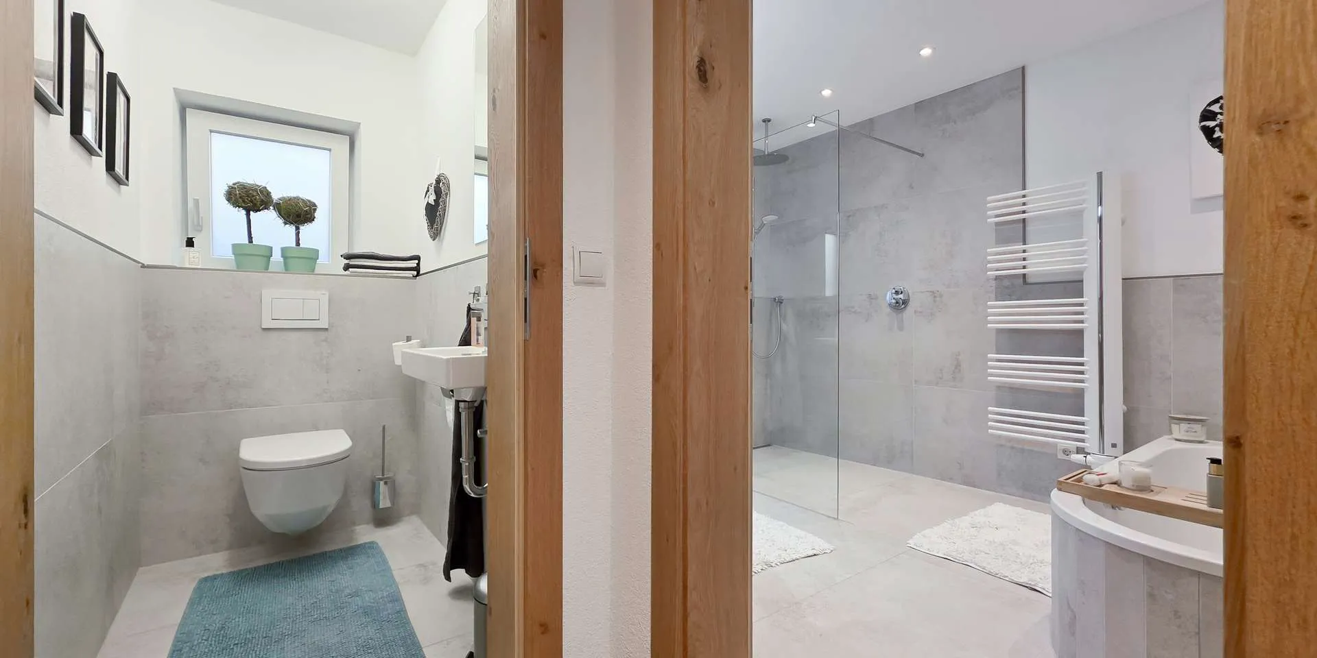 Das Hauptschlafzimmer mit eigenem Schrankraum überzeugt durch eine stylische Altholzwand mit indirekter Beleuchtung und ist äußerst ruhig gelegen. Das großzügige Badezimmer mit XL-Dusche, Wanne und breitem Waschtisch hat neben einem Handtuchheizer und Spots ein uneinsehbares Fenster. Das WC ist separat.