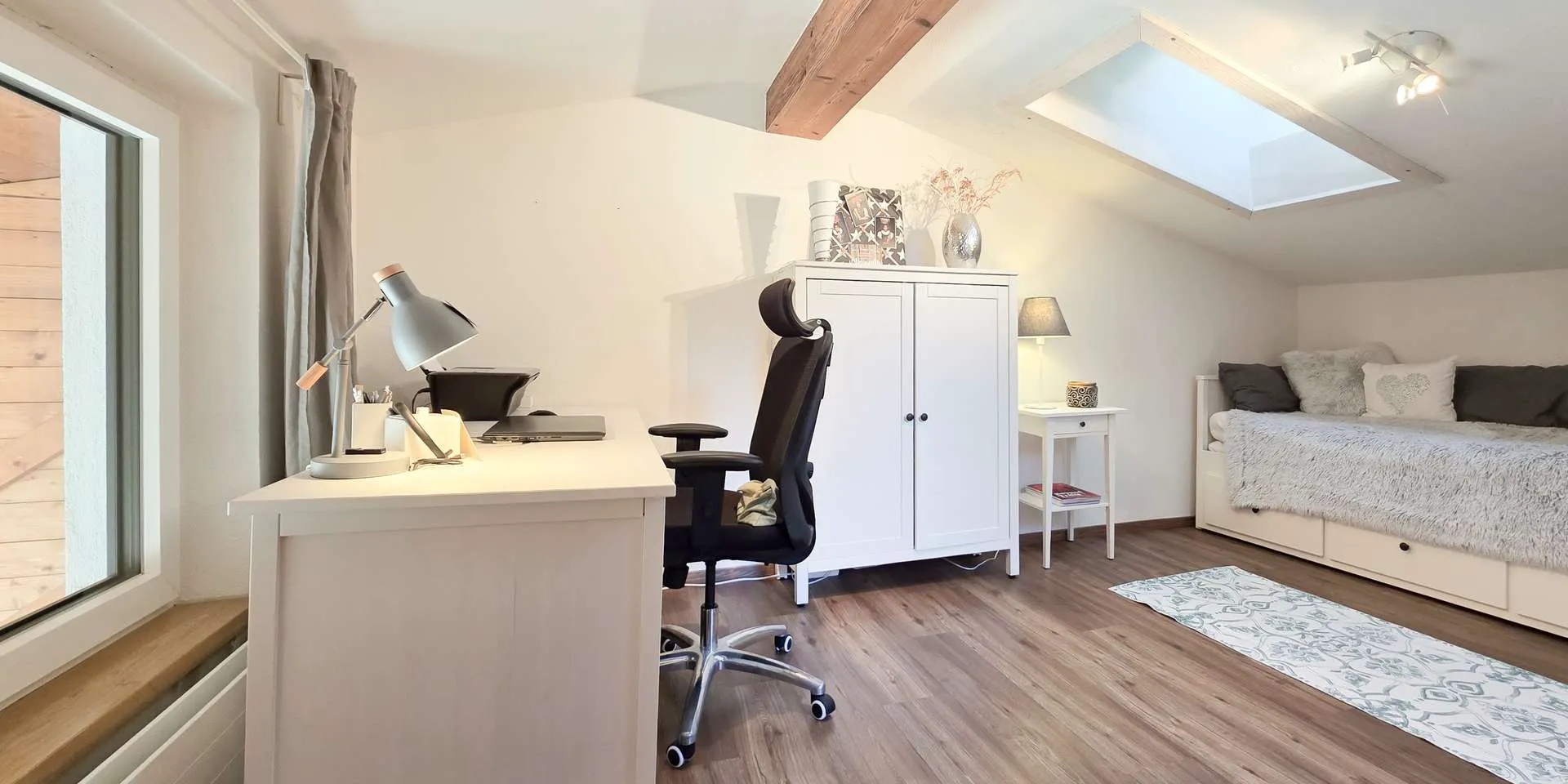 Die Galerie kann als Büro, aber auch als zweites Schlafzimmer genutzt werden, von der aus man einen niedrigen Zugang zu der ca. 10m2 großen, quadratisch geschnittenen Westterrasse hat.