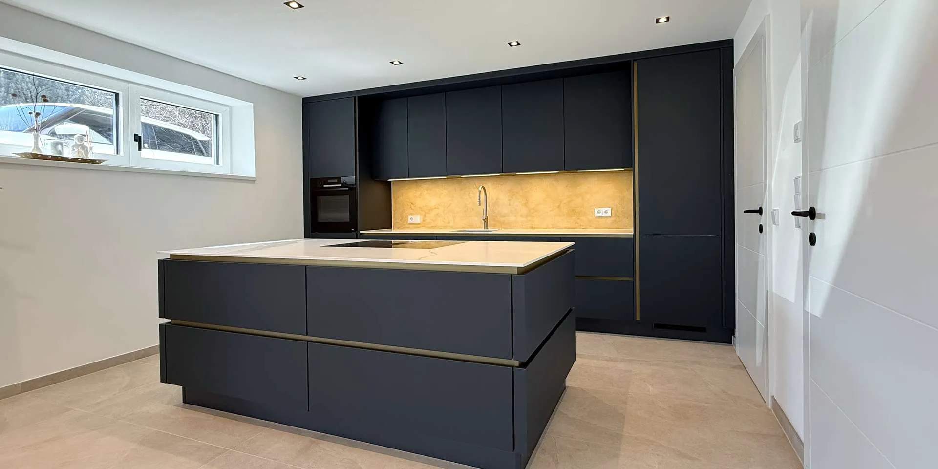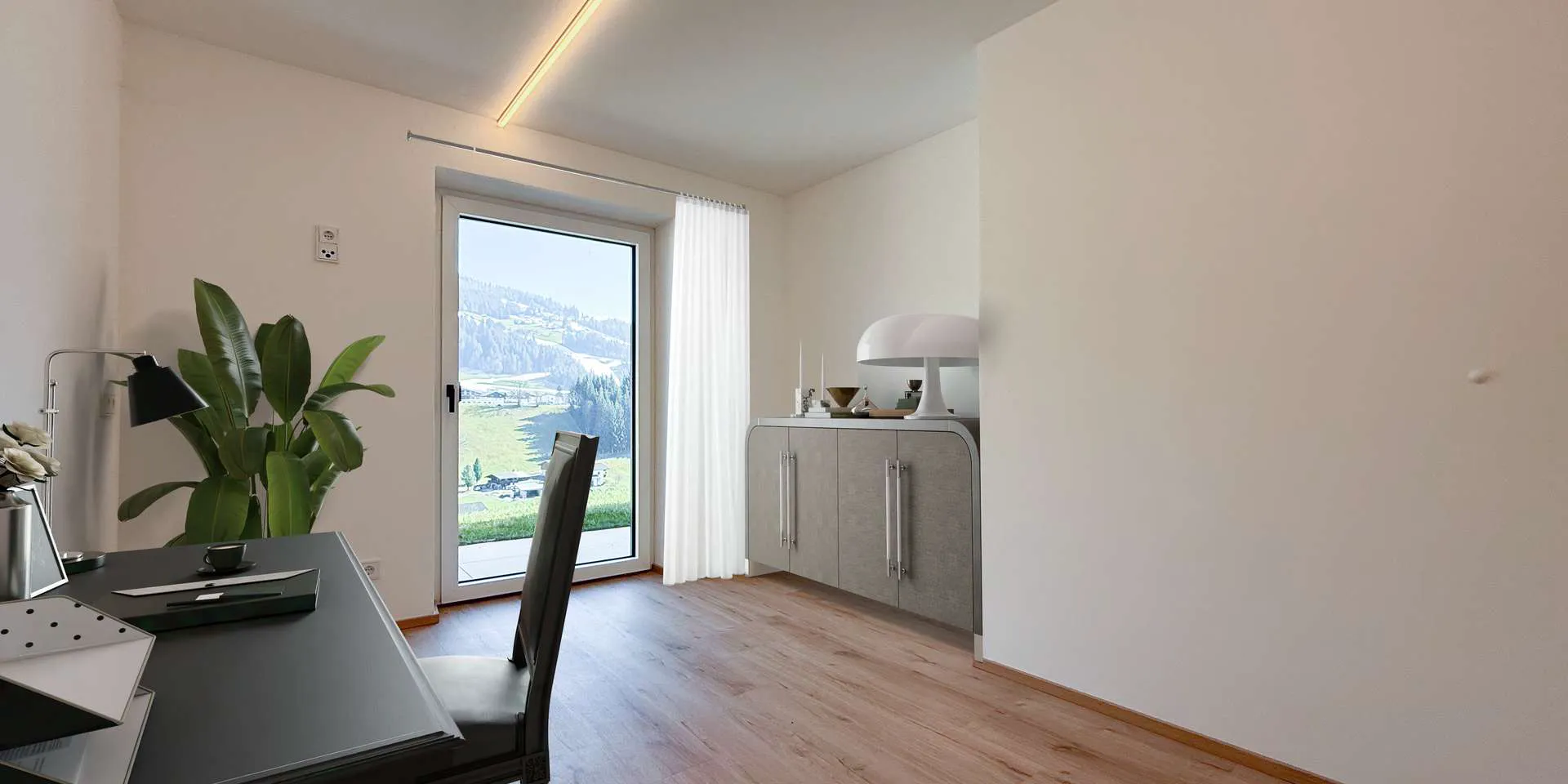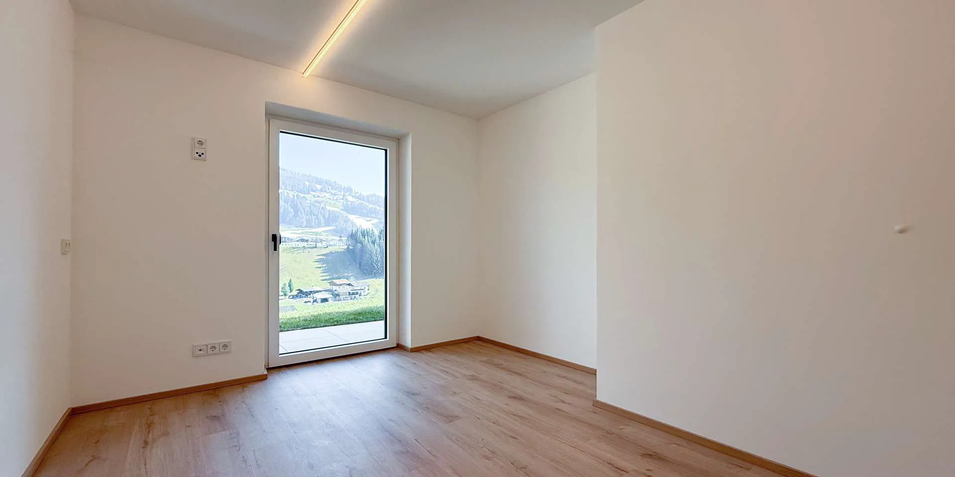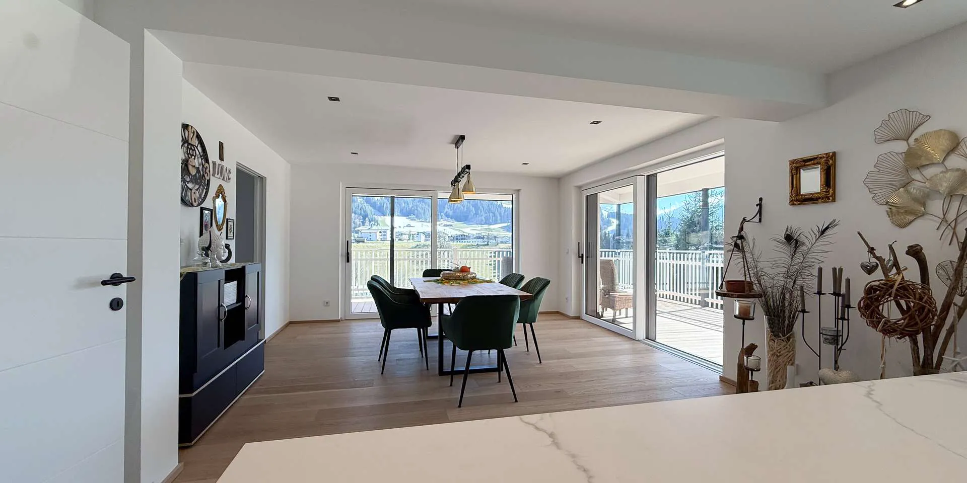 Über den Eingangsbereich auf der Nordseite gelangt man direkt in den Koch-/ Essbereich mit anschließenden Wohnbereich. Die Küche mit Bora und Bosch Geräten wie auch die anliegende Speis wurden von einem lokalen und renommierten Tischlermeister verbaut. Über zwei große Glasschiebeelemente und einer weiteren Dreh-Kipp-Türe ist der knapp drei Meter tiefe Balkon Südbalkon erreichbar mit Blick Richtung Westendorf, dem Kitzbüheler Horn, der Choralpe und dem Windautal. Als echter Hingucker rundet ein goldenes Gäste-WC diese Ebene ab.