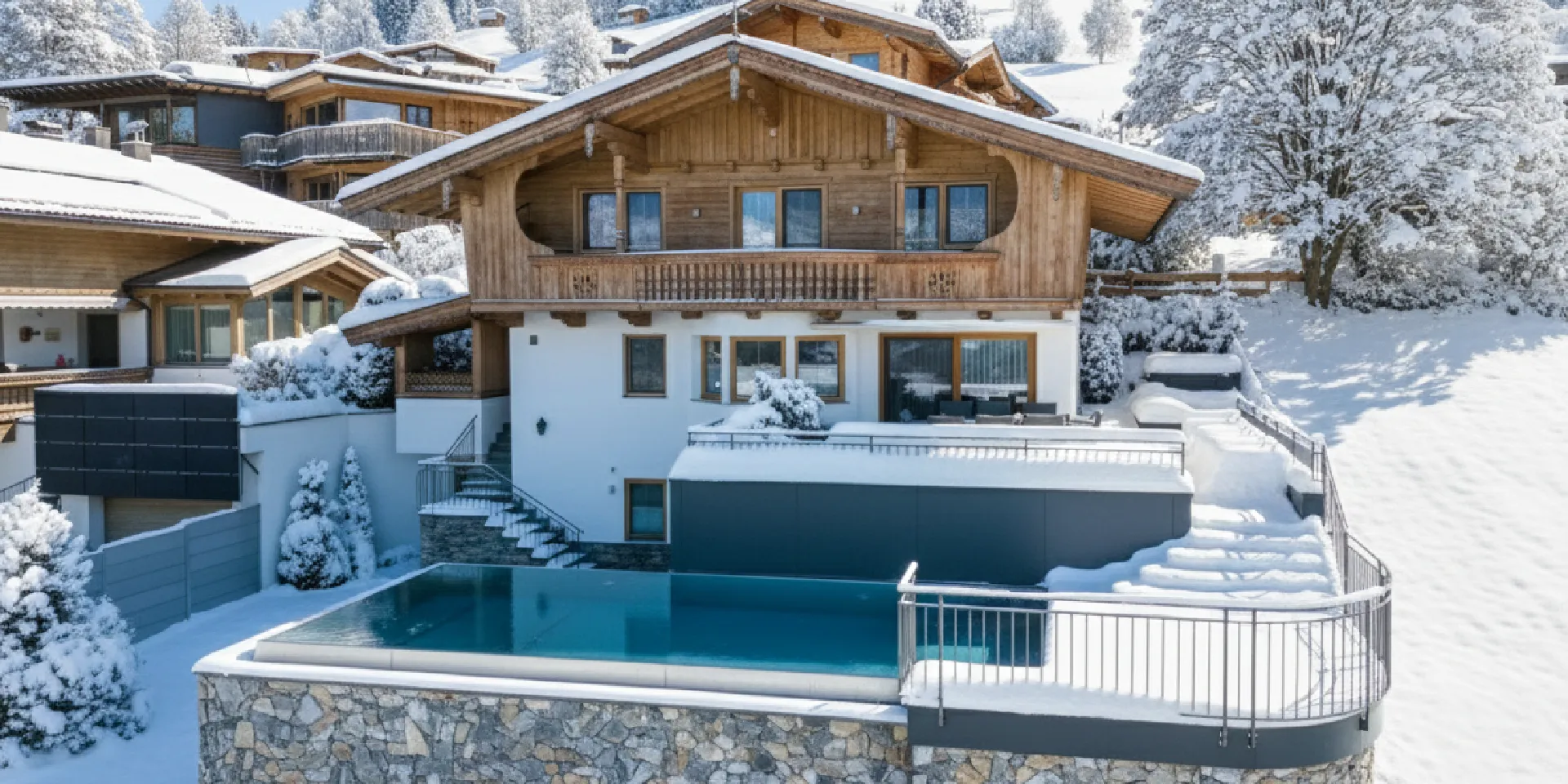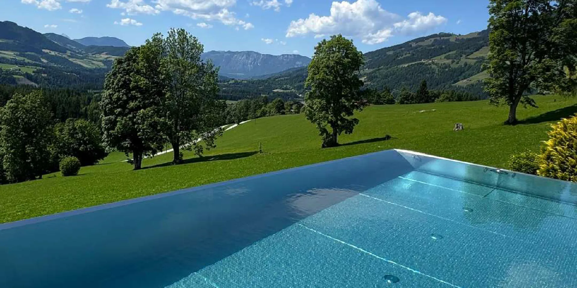 Über ein großes Schiebeelement gelangen Sie auf die 56m2 große, nahezu quadratische, neu verkleidete Südwest Terrasse, wo sofort klar wird, dass es sich um etwas ganz besonderes handelt. Ein majestätischer Blick, wie man ihn nur von Aussichtsplattformen kennt! Dem nicht genug, funkelt davor das Wasser eines 8,0m × 3,5m großen Double-Edge Infinitypools mit Gegenstromanlage, Beleuchtung und Heizmöglichkeit.
