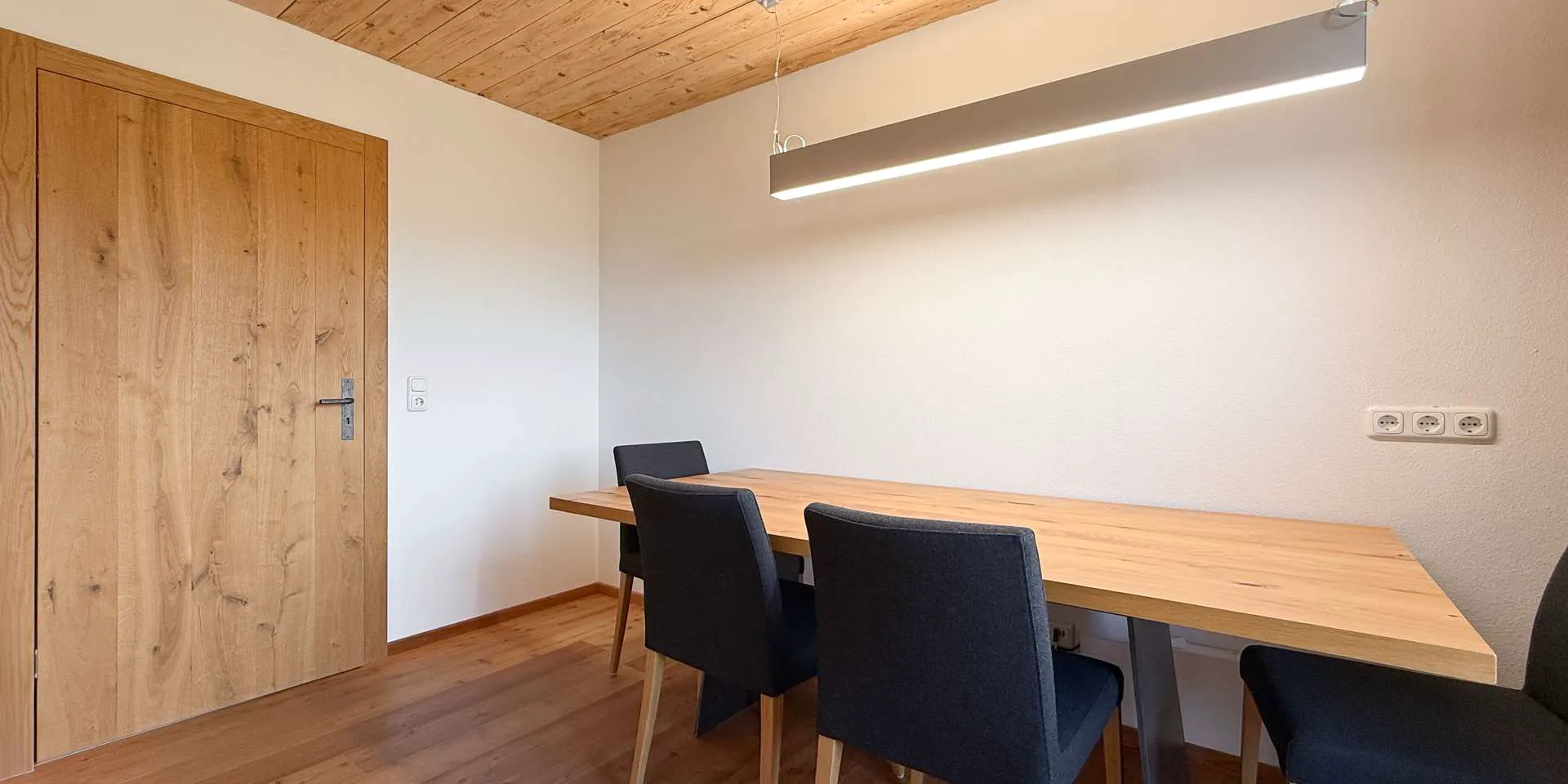 Die Hauptwohnung ist über einen großzügigen geschlossenen Vorraum im Erdgeschoss, aber auch über einen Vorraum/ Lagerraum im Souterrain zugänglich. Im Erdgeschoss befinden sich neben der Küche mit Bora und Bosch Geräten ein Gäste-WC, ein Abstellraum und der Haupt- Wohn-/ Essbereich. Dieser zeichnet sich durch helle Holzvertäfelungen, eine gemütliche Eckbank mit Erkerfenster und Kachelofen und eine praktische Durchreiche zur Küche aus.