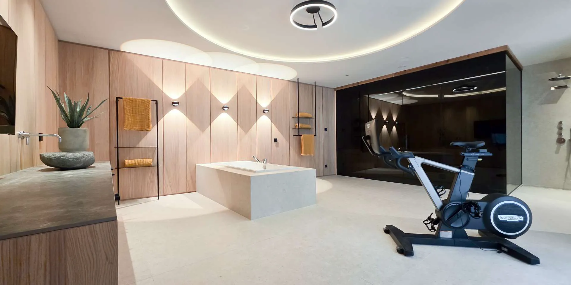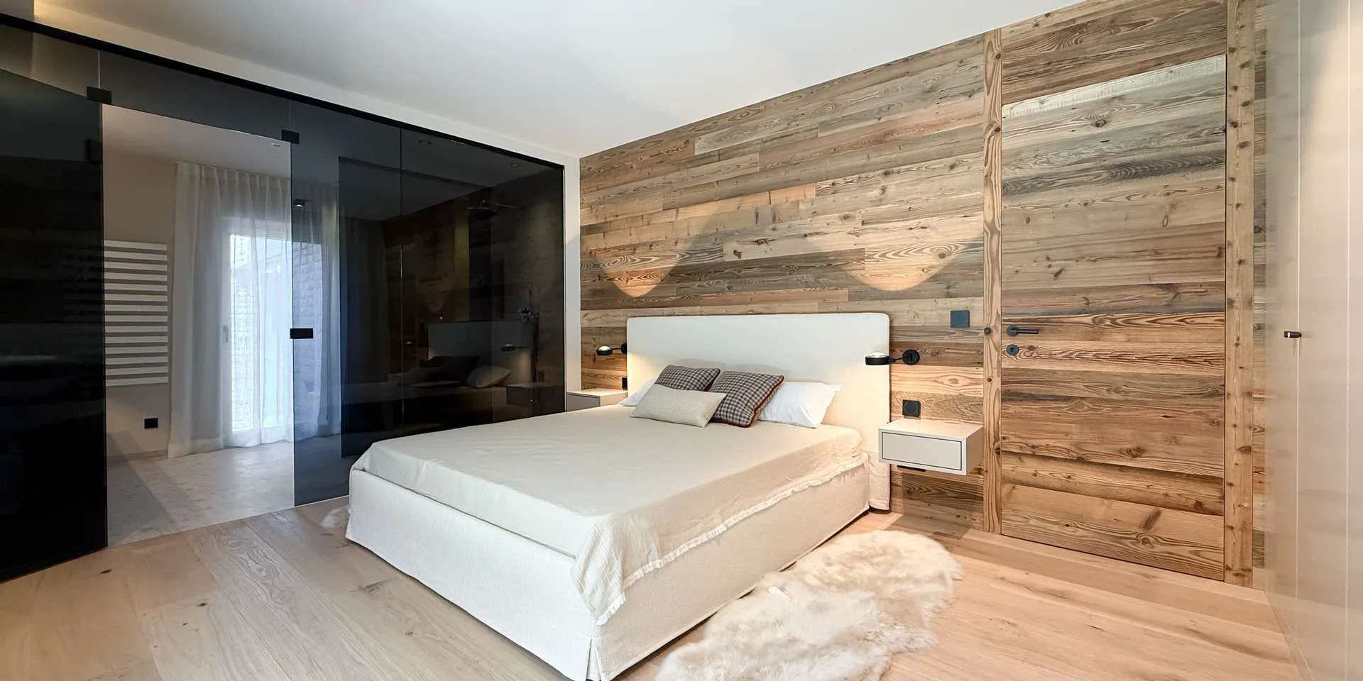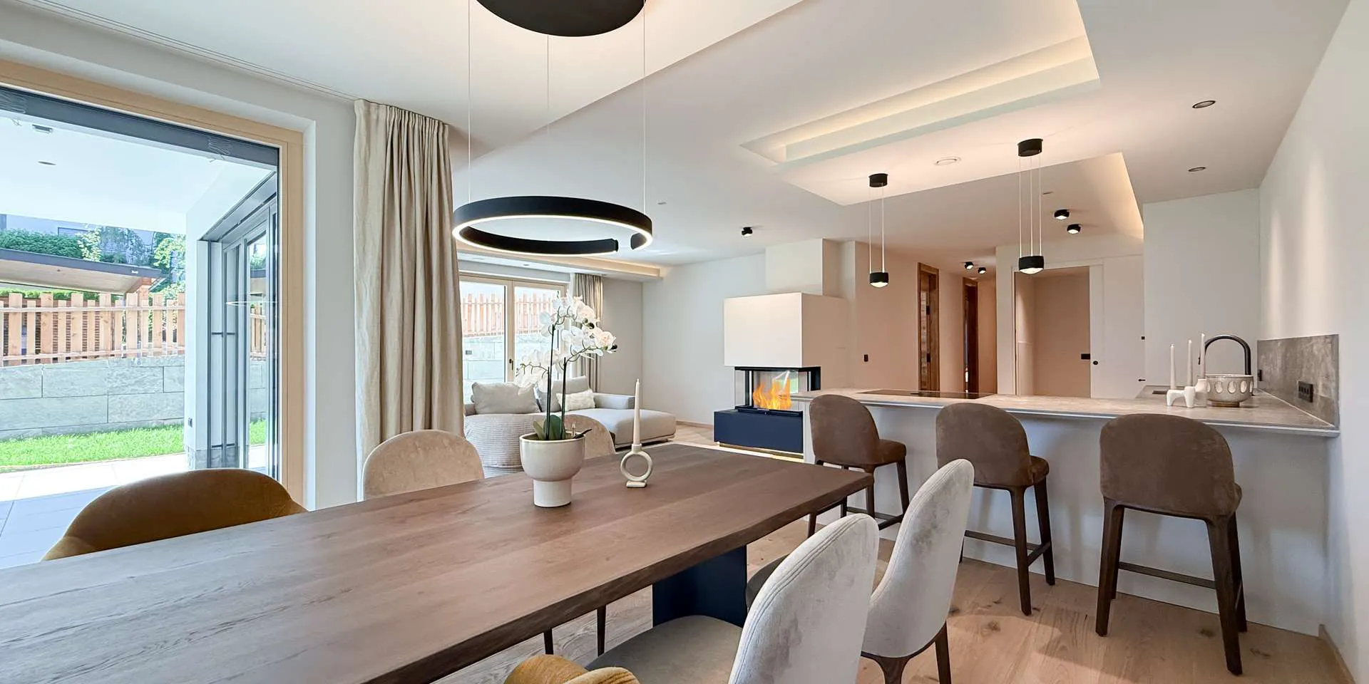 Bereits bei der massiven Altholz Eingangstüre sowie der Altholzinnentüren wird die Qualität der Ausstattung klar. Diverse Schreiner Einbaukästen, ein Loxone System, der offene Kamin, die Occhio Lampen und die Profi-Küche sorgen neben den sorgfältig ausgewählten Oberflächen für maximales Wohlbefinden.