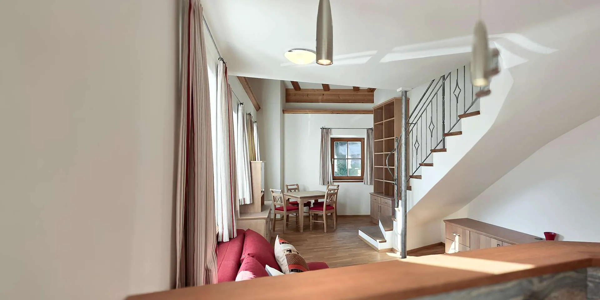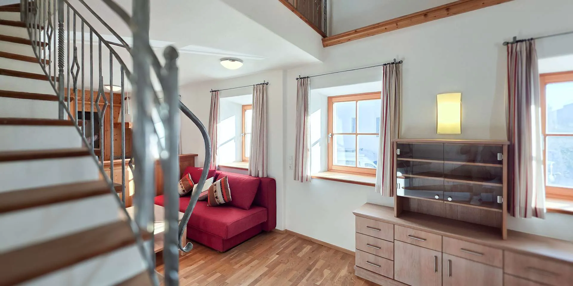 Über die wohnungsinterne Stahlbetontreppe mit schmiedeeisernen Geländer gelangen Sie in die Galerie, welche ideal als Büro genutzt werden kann. Anschließend liegt das Schlafzimmer mit Schranknische und Bad en Suite mit Dusche, Eckwanne und WC.