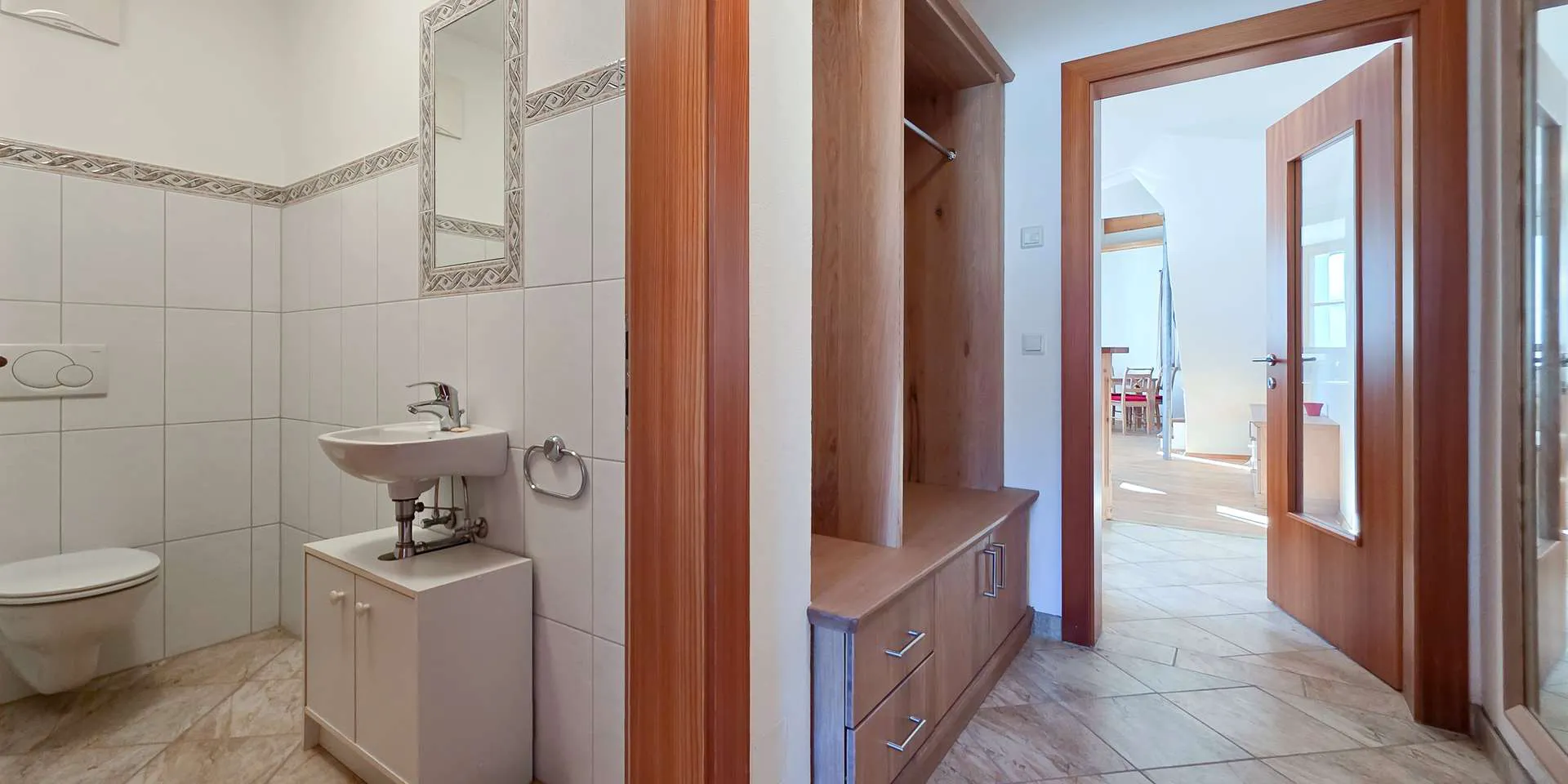 Über eine außenliegende Treppe gelangen Sie zu der allgemeinen Gang-/ Verteilerfläche des 1.Obergeschosses. Dort betreten Sie die nach Osten sowie Süden ausgerichtete Wohnung über eine geräumige Garderobe mit seitlichem Gäste-WC. Im direkten Anschluss befindet sich der geräumige und längliche Wohn-/ Ess-/ Kochbereich mit Speis.