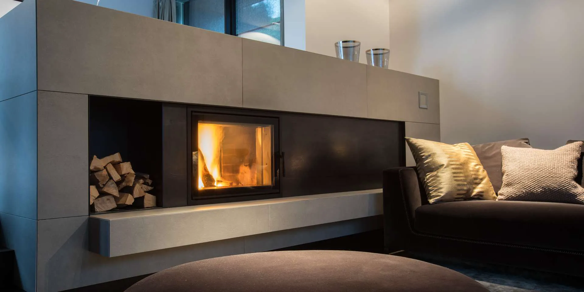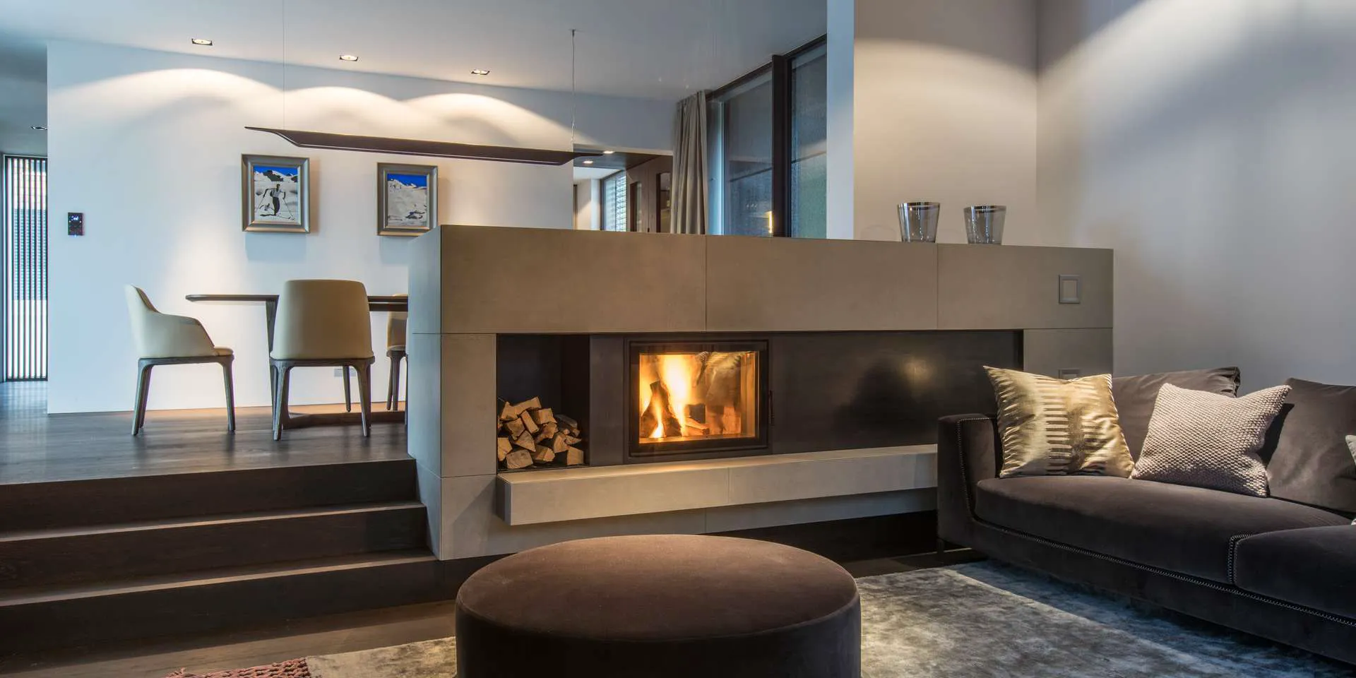Als halbhoher Raumtrenner wurde zwischen dem abgesenkten Wohnzimmer und dem Essbereich ein von zwei Seiten zugänglicher offener Kamin mit Schamotteinsatz verbaut.
