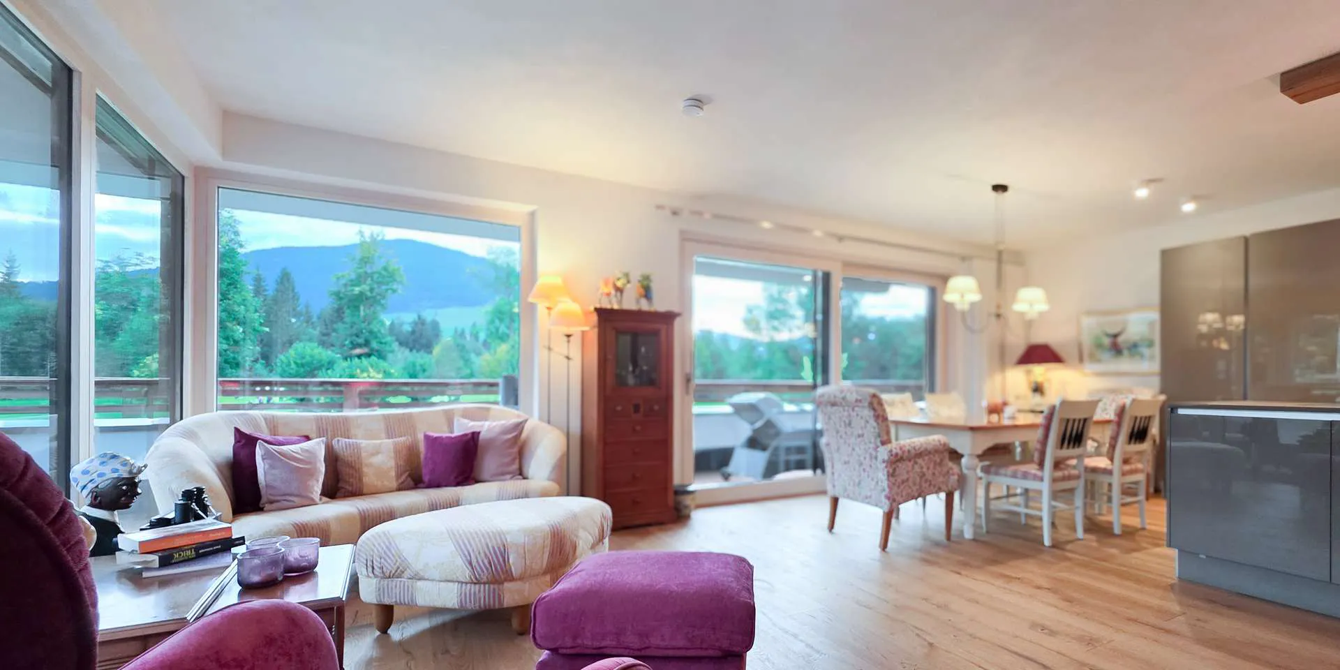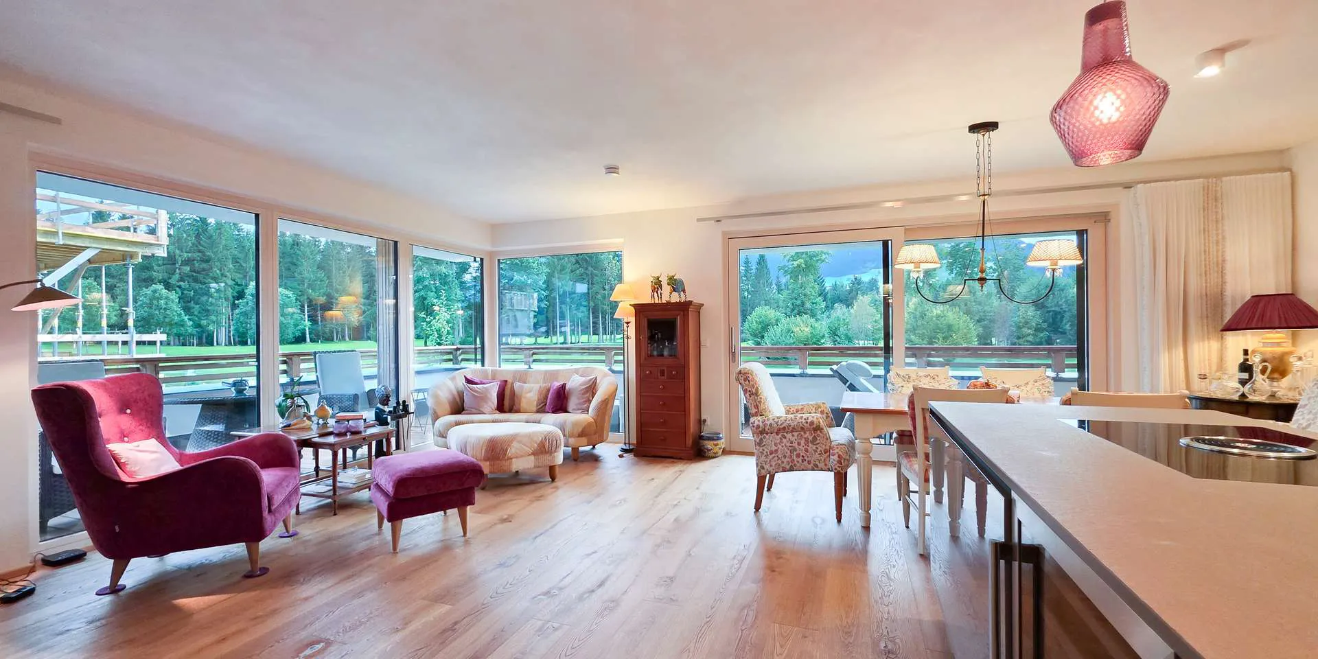 Der Wohn-/Ess-/ Kochbereich wurde mit großen Übereck-Fensterelementen, einem schönen und zeitlosen Dielenboden, einem offenen Kamin und einer Tischler-Einbauküche mit Kochinsel ausgestattet.