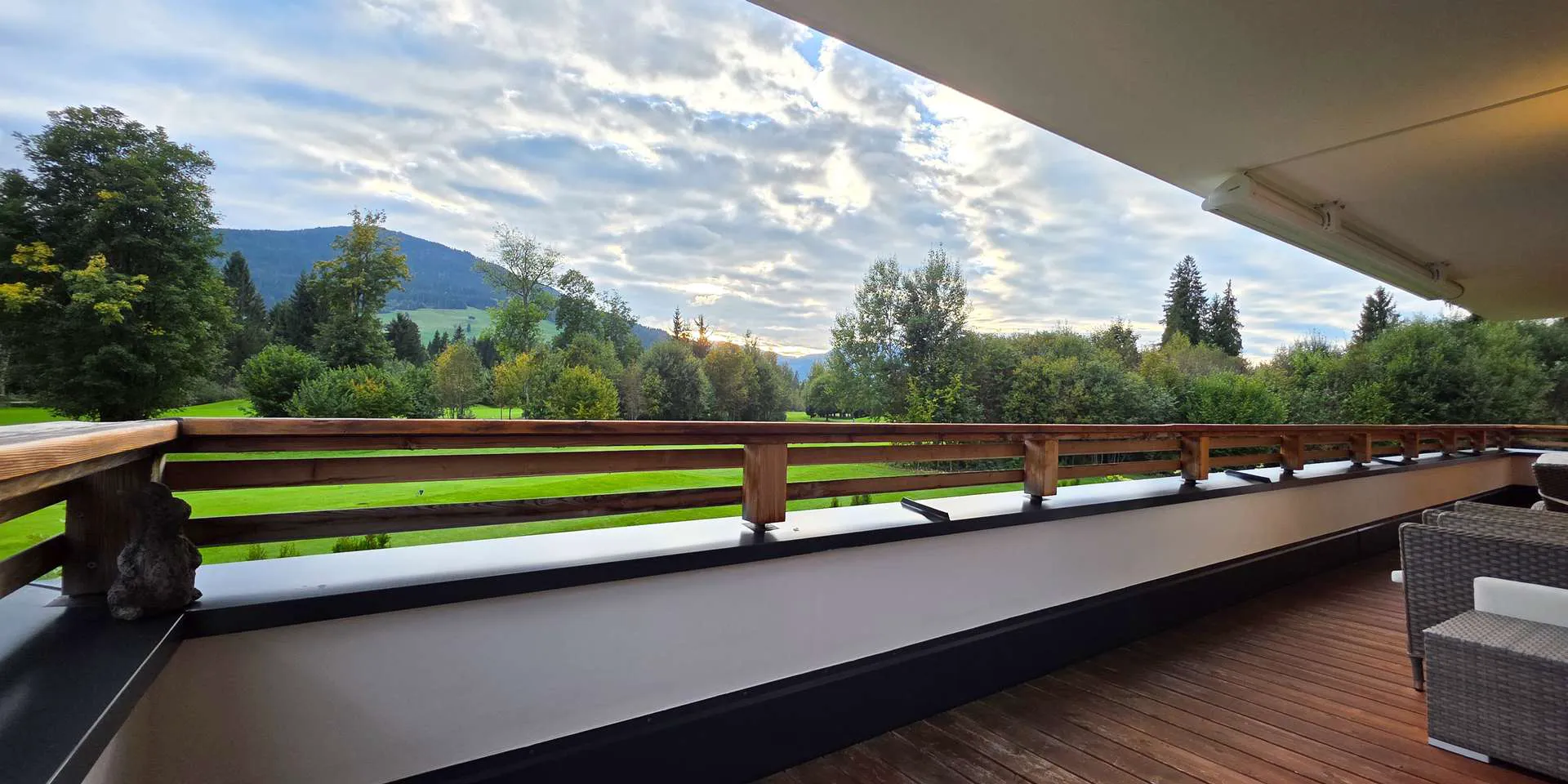 Für ein gutes Raumklima wurde ein Lehmputz verwendet. Zwei Terrassen mit insgesamt 39m2 verbinden Natur und Wohnung. Diese wurden mit Lärchenholz beplankt, wobei die Hauptterrasse atemberaubende Sonnenuntergänge über dem Golfplatz garantiert.