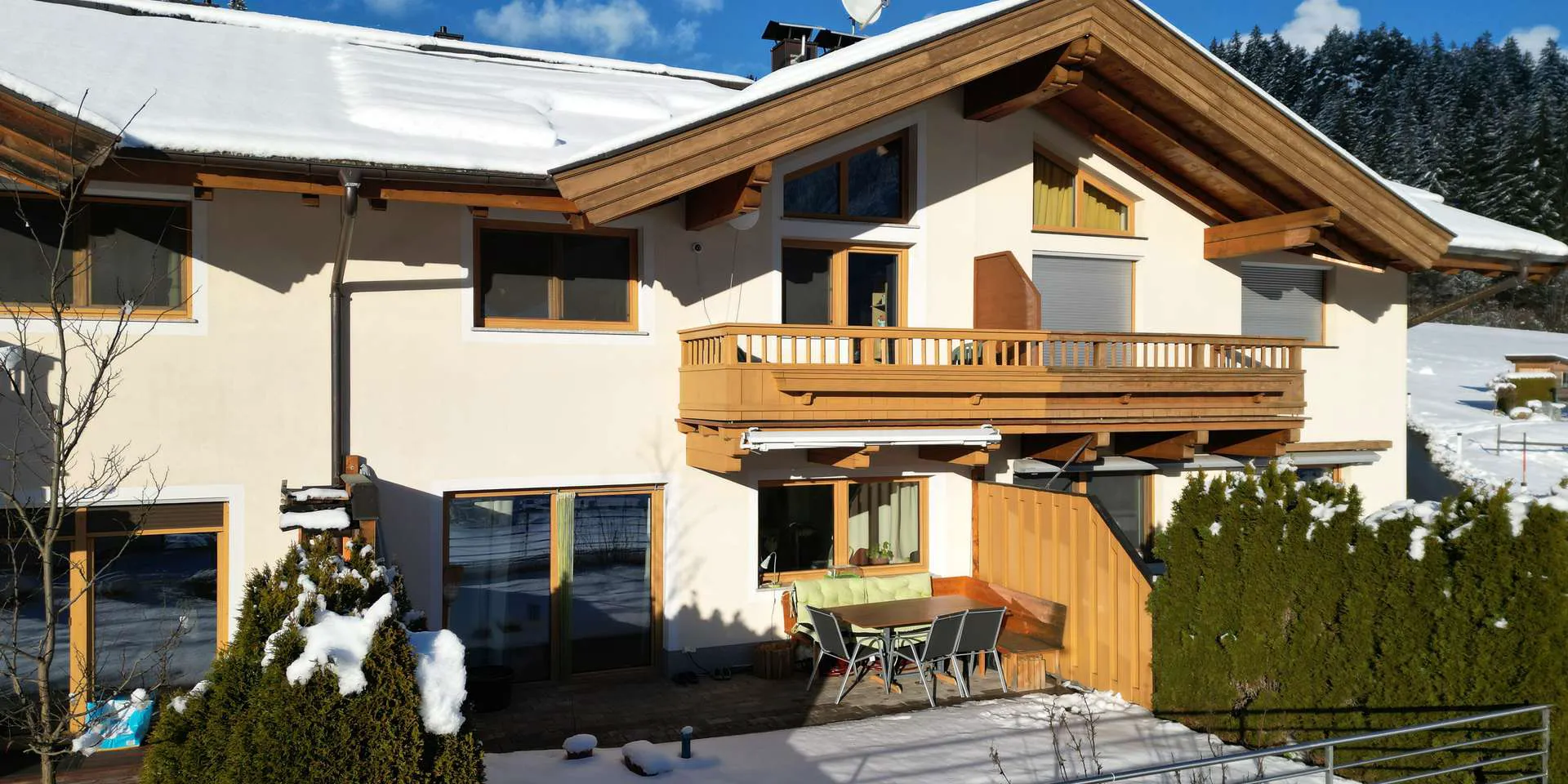 Dieses ruhig gelegene Reihenhaus befindet sich in ausgezeichneter Lage am Sonnenhang von Brixen im Thale. Der Bäcker, ein Gasthaus, der Bahnhof, die Bushaltestelle sowie der Nahversorger sind etwa 1 km entfernt. Aber auch die Tennishallen, der Einstieg zur Langlaufloipe wie auch der Skibus und eine Wellnesseinrichtung sind unter 1 km entfernt. Die Skiabfahrt läuft direkt neben dem Haus vorbei.