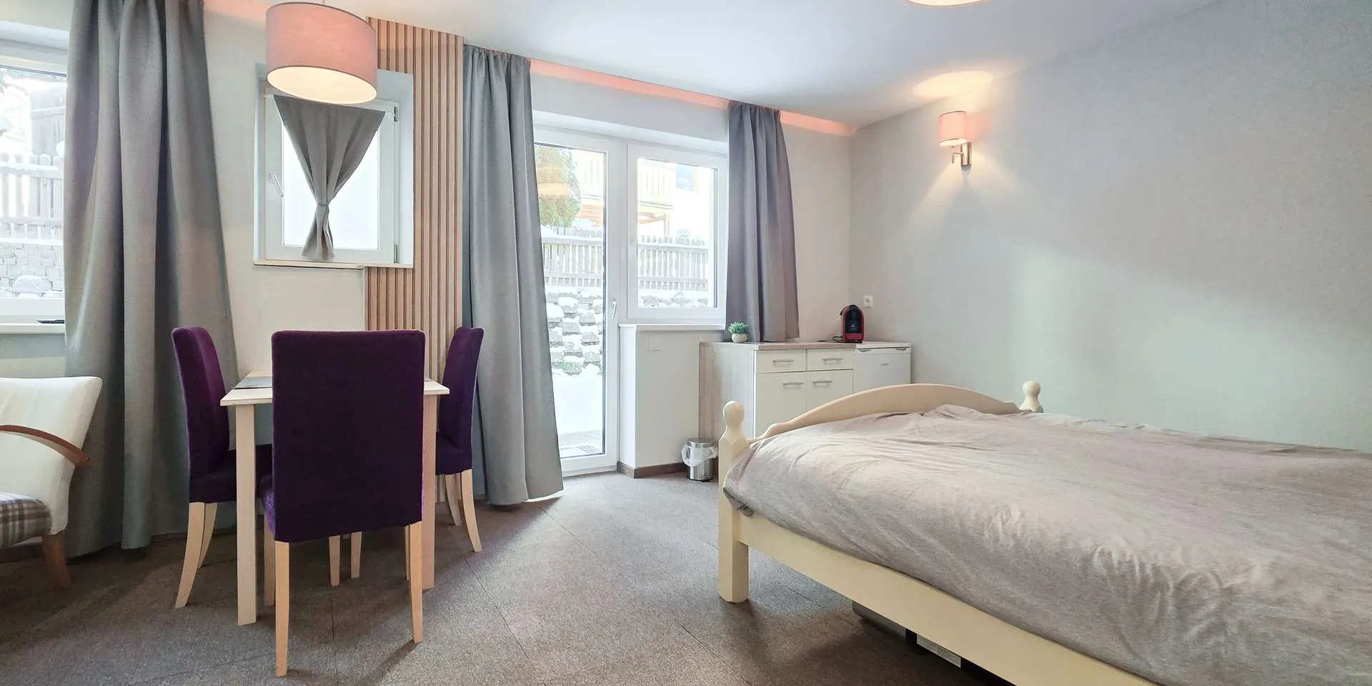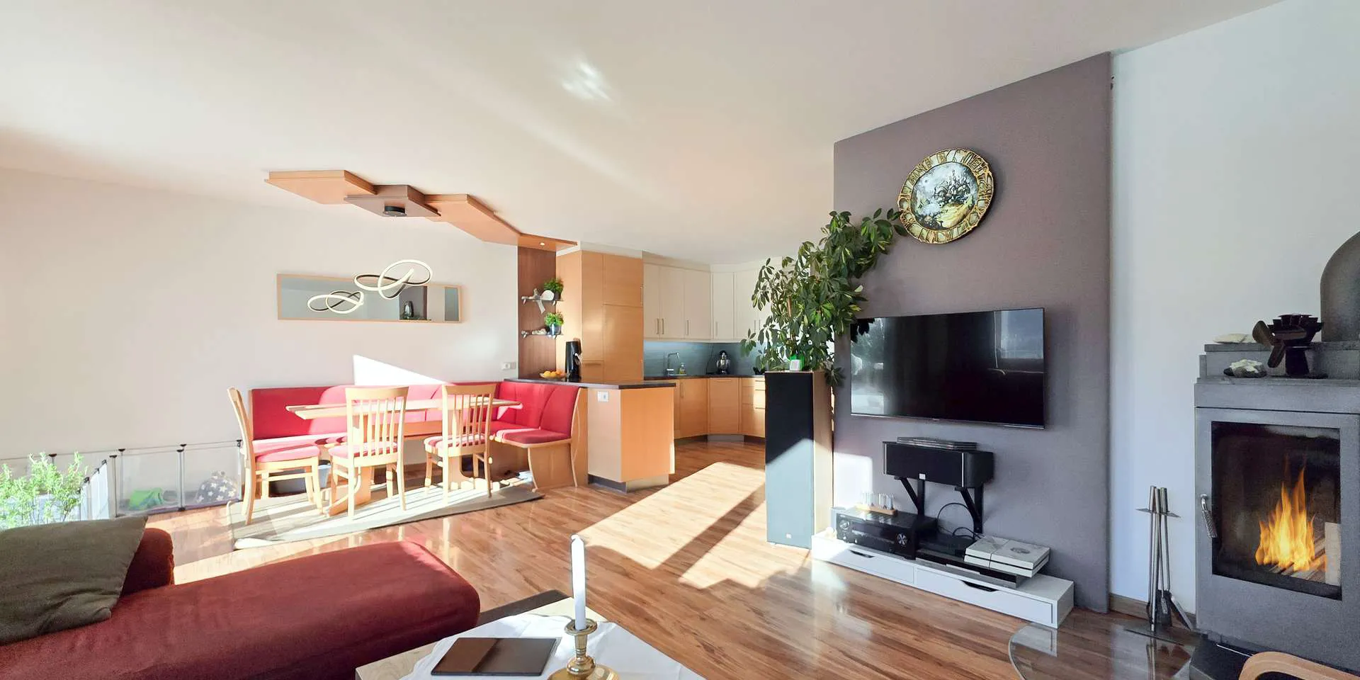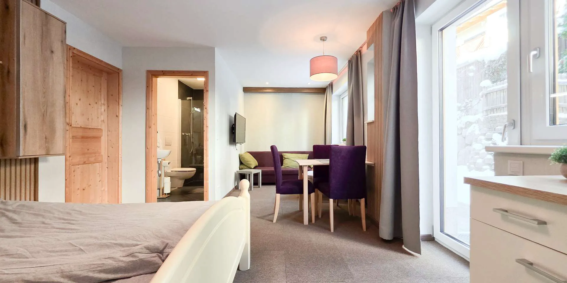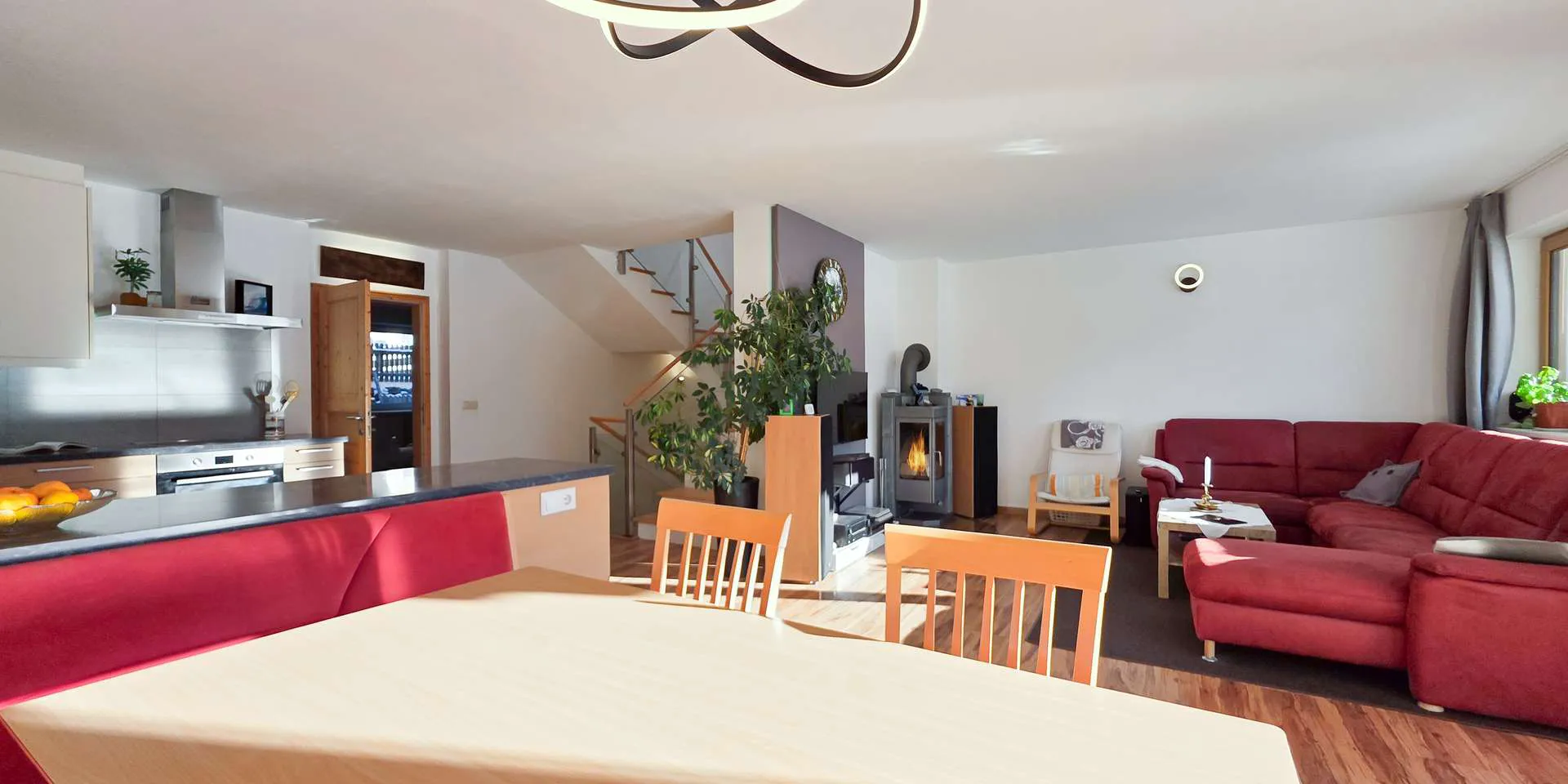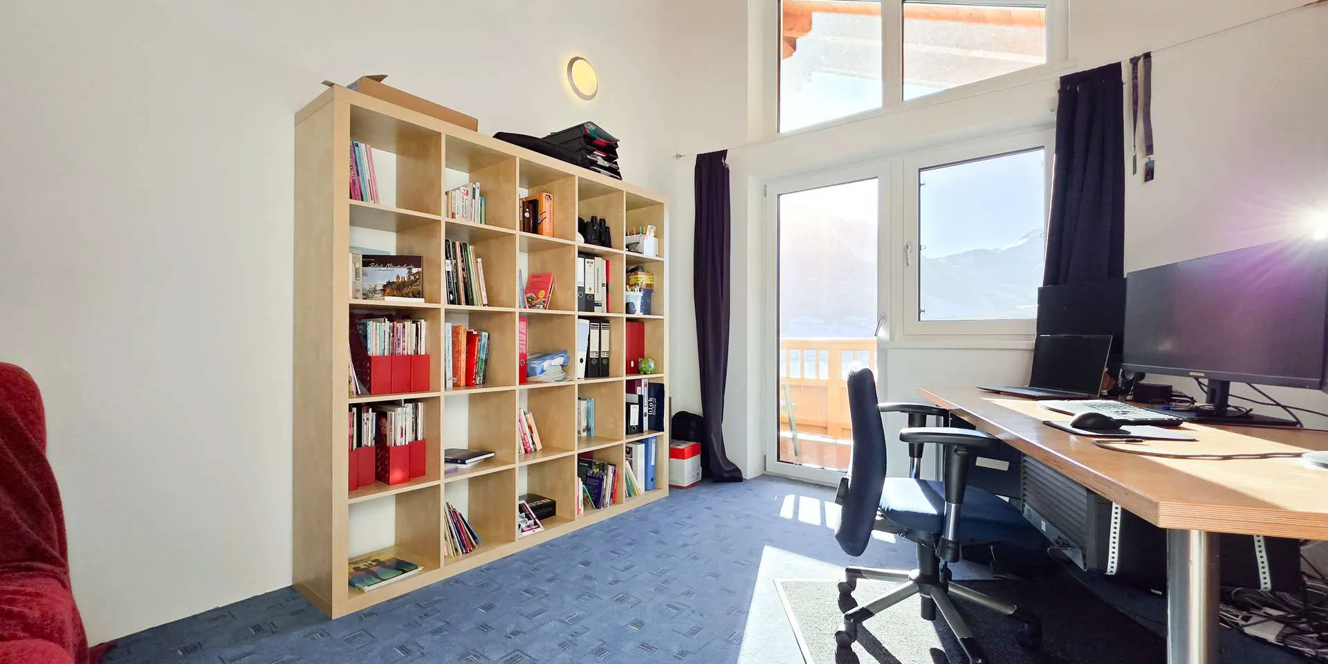 Das Erdgeschoss wurde kürzlich umgebaut, wodurch nun hinter dem 44m2 großen Wohn-/Ess-/Kochbereich eine kleine Einliegerwohnung mit eigenem Badezimmer geschaffen wurde. Ein Küchenanschluss ist in der Einliegerwohnung vorhanden. Das Highlight ist auf dieser Ebene neben dem offenen Kamin die nahezu quadratische, über 40m2 große Südterrasse mit spektakulärem Bergblick.