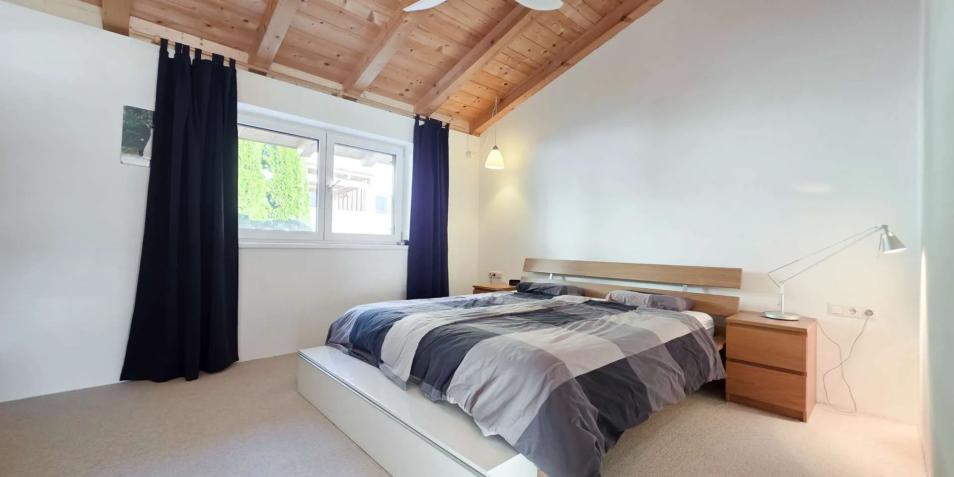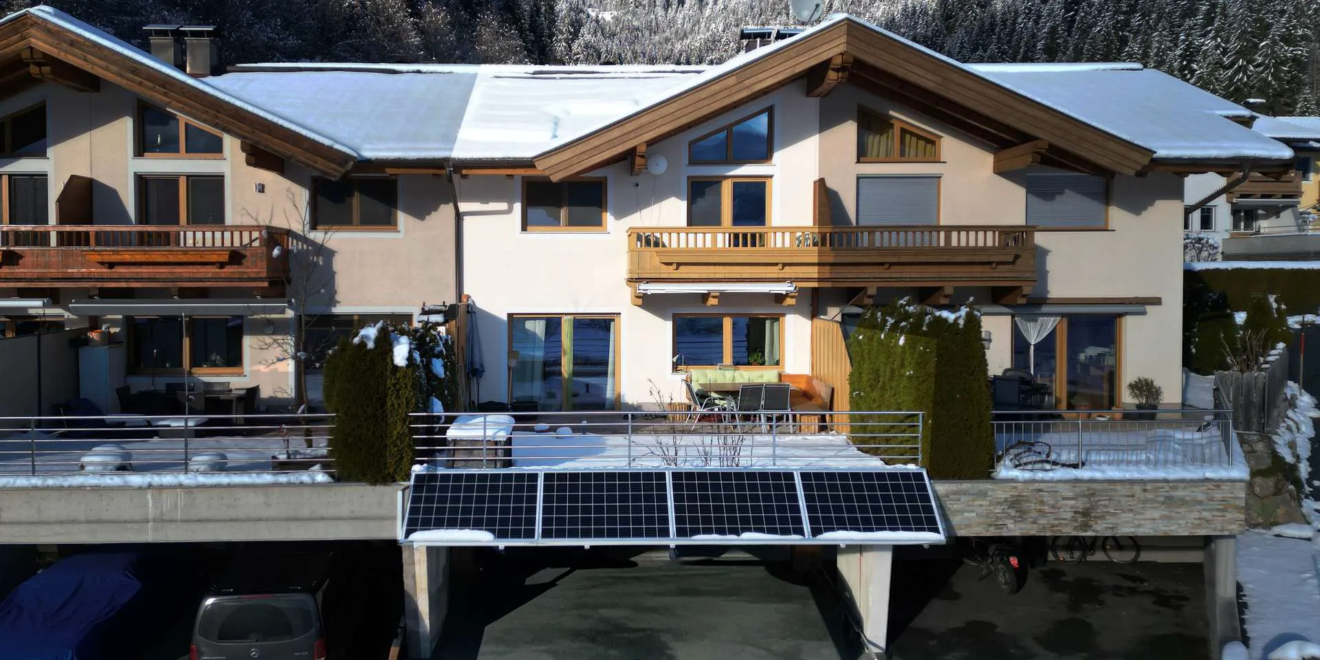 Im Dachgeschoss sind 3 Schlafzimmer und ein großzügiges Badezimmer untergebracht. Diese Ebene zeichnet sich durch einen hohen Sichtdachstuhl aus. Auf dem Dach und stirnseitig über dem Carport wurden 34 PV-Elemente mit Micro Wechselrichter verbaut mit 11,22 kWp.