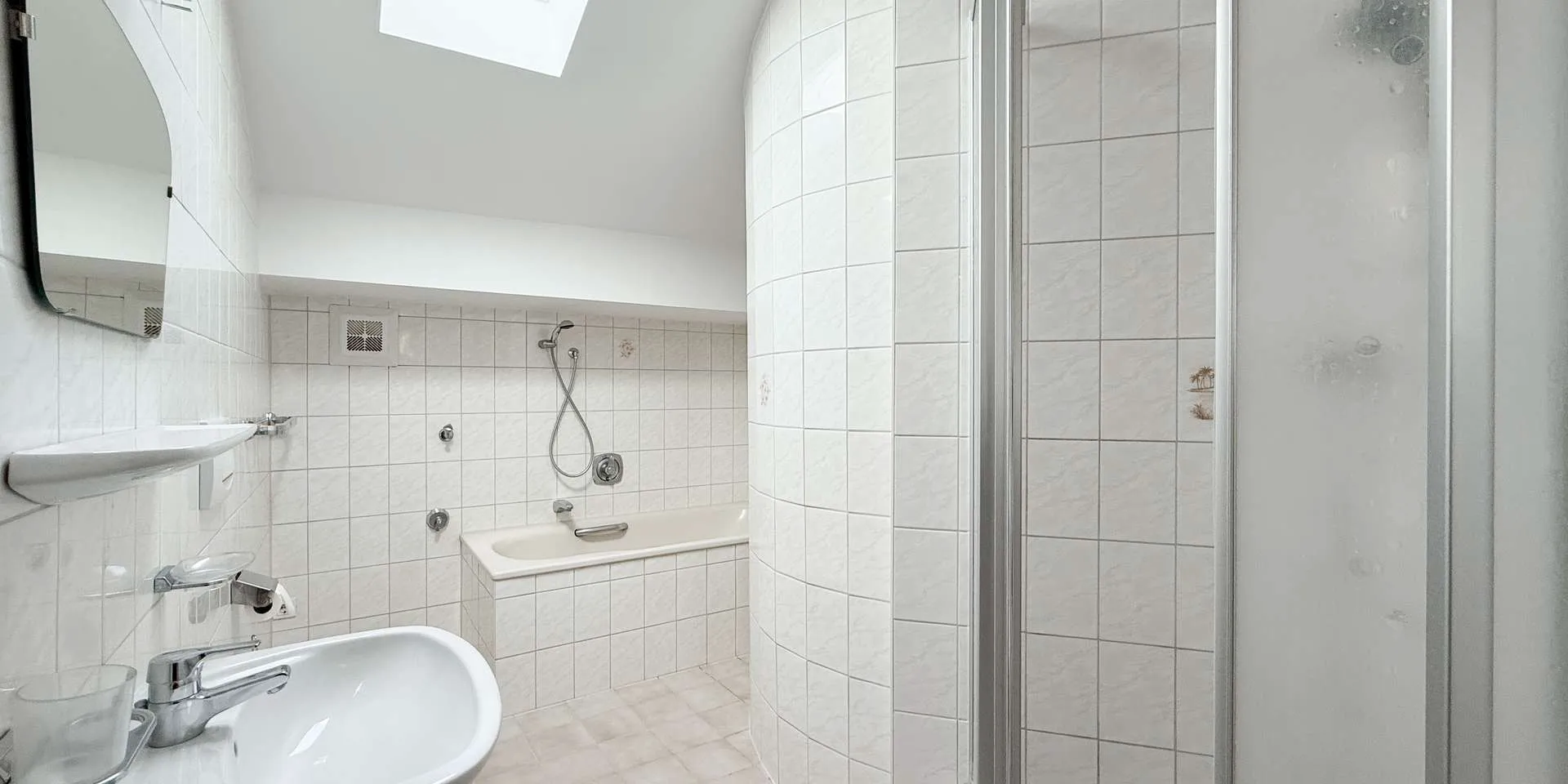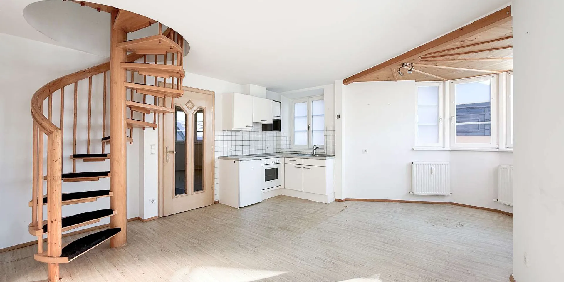 Der Eingangsbereich der Wohnung überzeugt mit Garderobenfläche, sowie einem Gäste-WC. Der lichtdurchflutete Wohn-Koch-Essbereich bietet einen Erker, sowie Zugang zum Südbalkon mit Bergblick. Vom Wohnbereich gelangt man per Treppe in das Dachgeschoss, wo sich zwei Schlafzimmer und das großzügige Badezimmer befinden. Das Tageslichtbadezimmer ist mit Dusche, Wanne sowie einem Waschmaschinenanschluss ausgestattet.