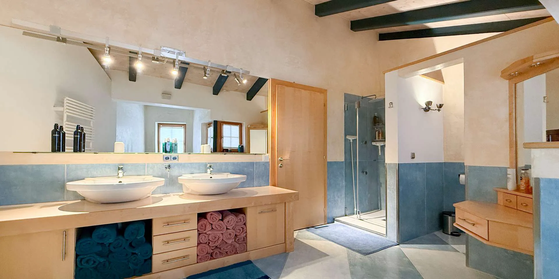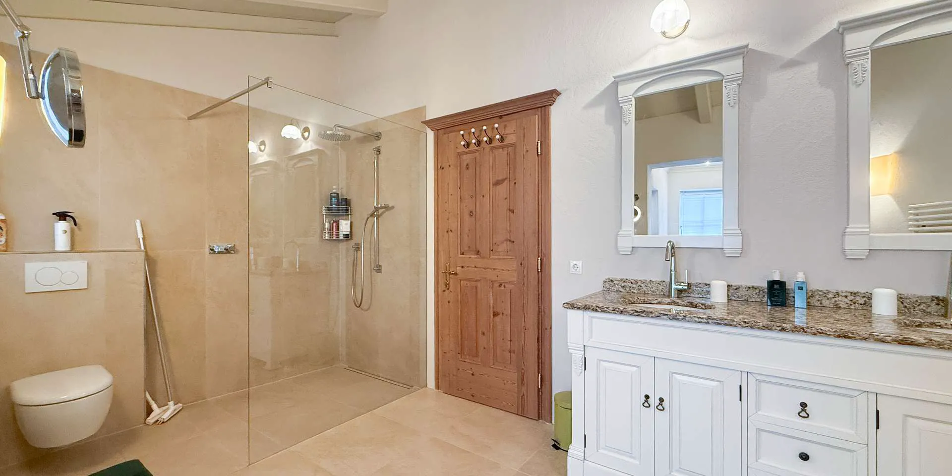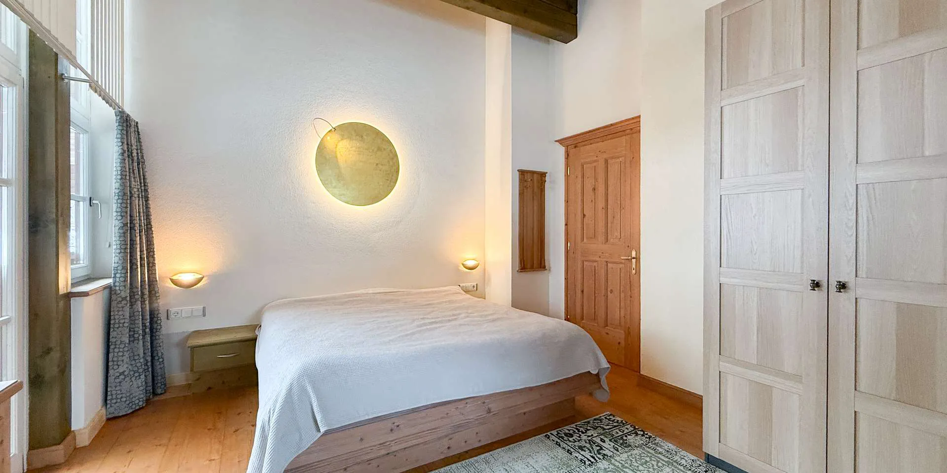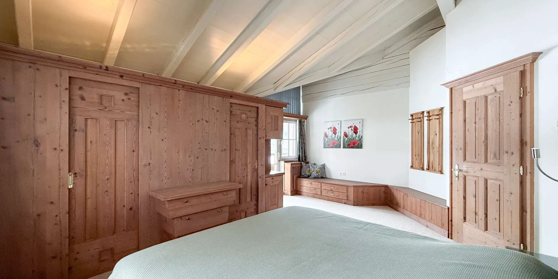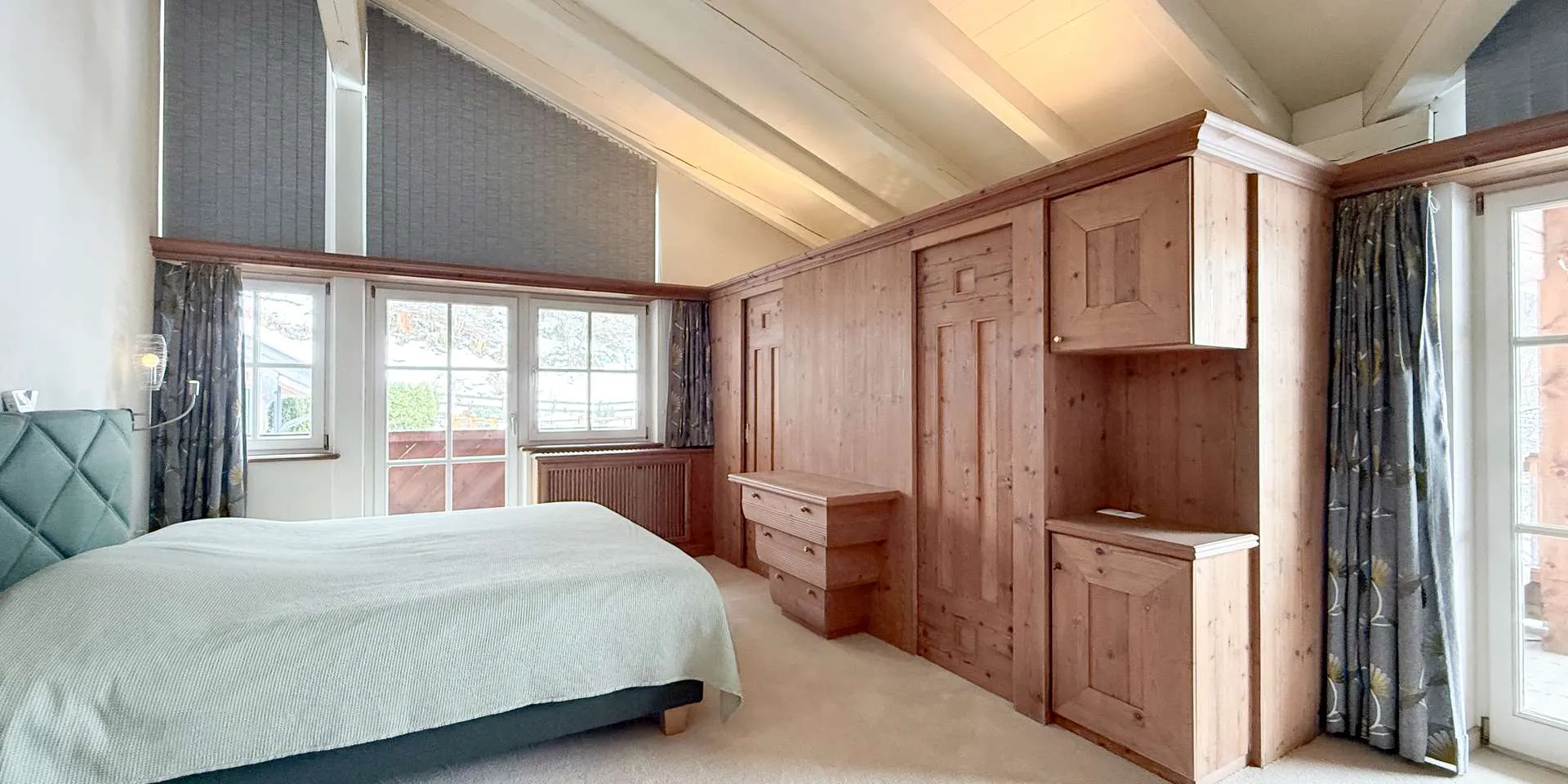 Im Obergeschoß beider Häuser befinden sich je drei überdurchschnittlich große Schlafzimmer, welche alle über einen Balkonzugang verfügen. Dank dem Sichtdachstuhl in diesem Geschoß erreichen alle Schlafzimmer ca. 4 Meter Raumhöhe. Ein geräumiges Badezimmer mit Dusche, Wanne, WC und Fenster befindet sich ebenso auf der Etage in jedem der Häuser.