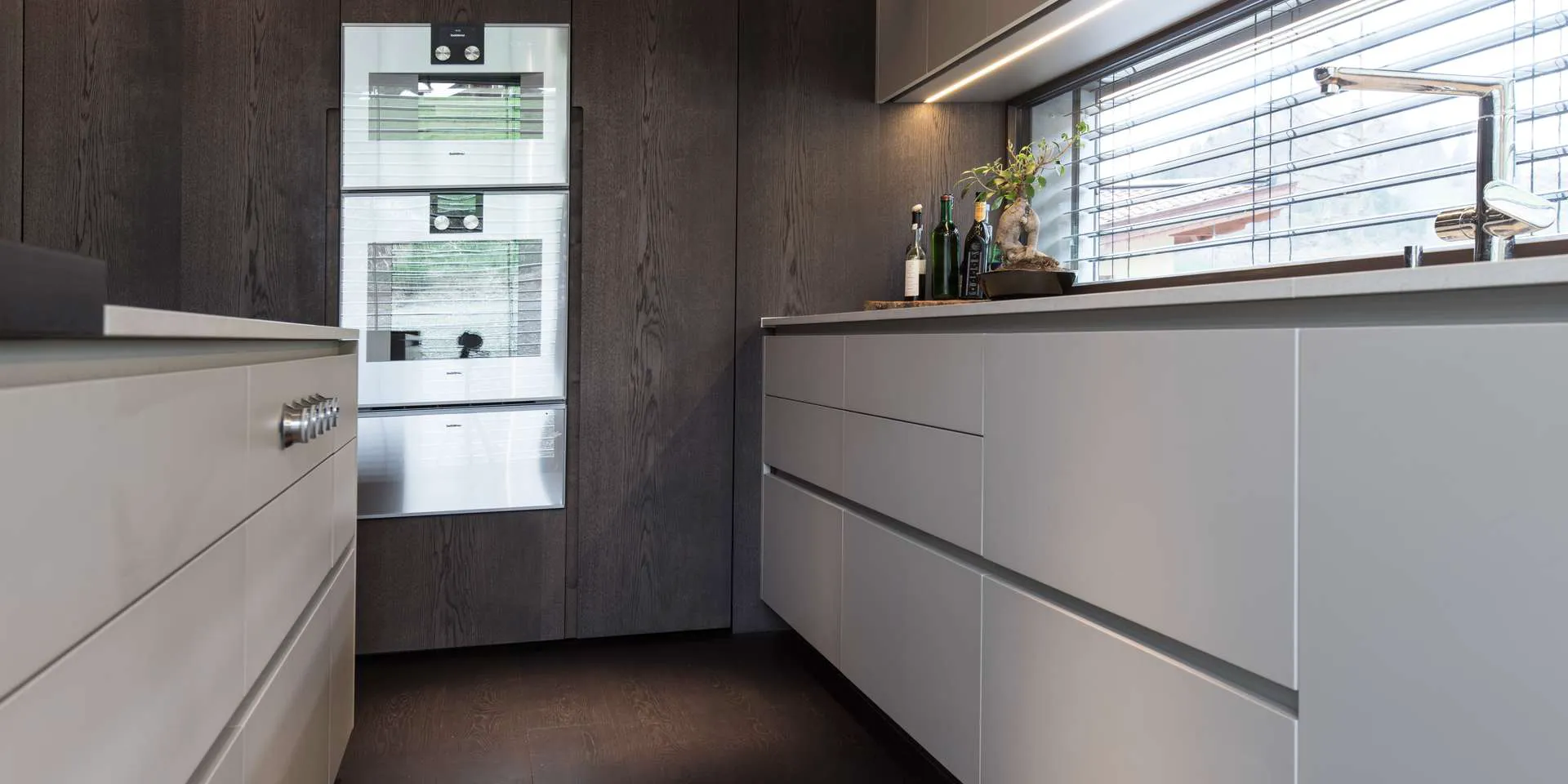 Die Nischen und Schränke wurden vom Tischler flächenbündig verbaut, die Innentüren und Fensterflächen sind raumhoch. Die 3-fach verglasten und farblich abgestimmten Internorm Holz-Alu-Fenster sind alle mit Verschattungen und teilweise mit Insektenschutz ausgestattet.